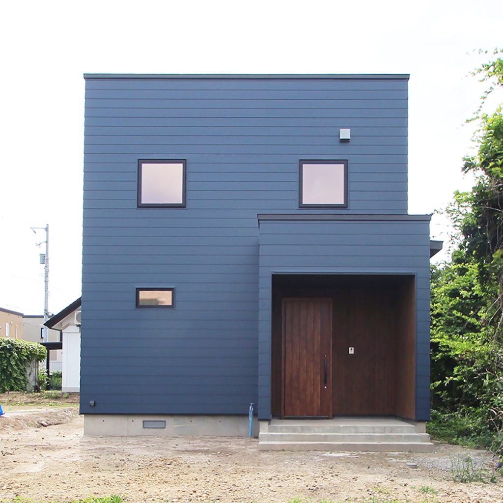 ネイビーのガルバリウム鋼板に北海道産の道南杉を組み合わせることで、クールな印象のなかにもぬくもりが感じられる外観となりました。