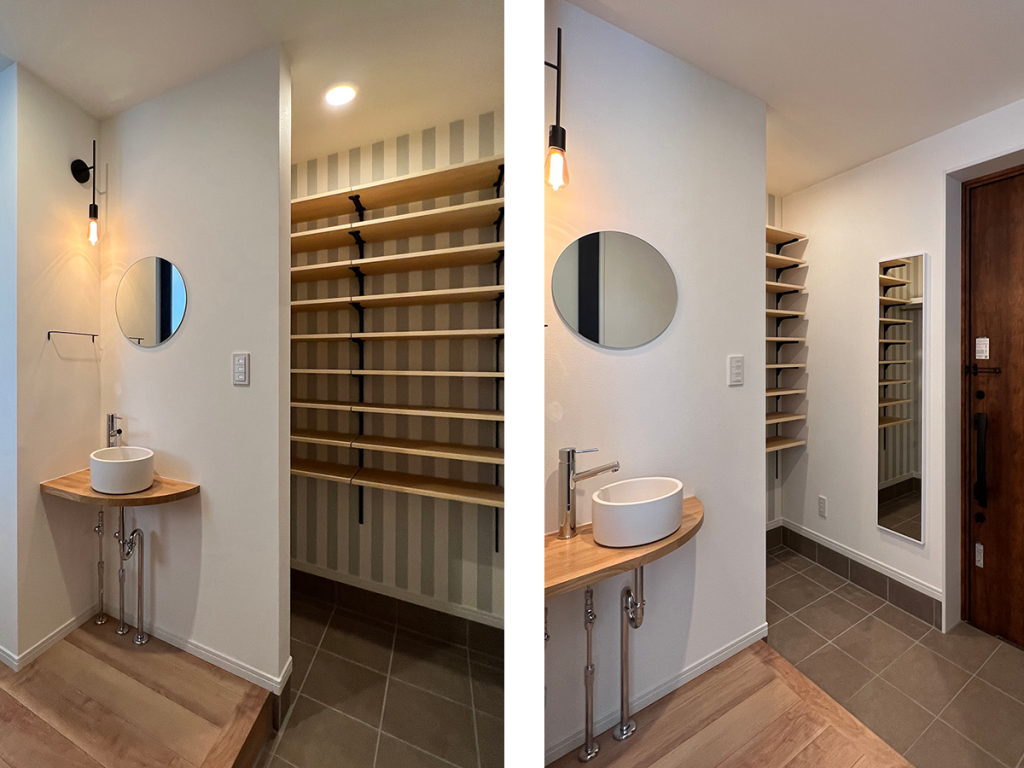 玄関を入るとすぐに『ただいま手洗い』が。玄関先に手洗いがあるとお子さまもすぐ手を洗えて便利ですね。玄関をスッキリとさせてくれる、収納力たっぷりのSCLは右手に。姿見の鏡も設置していますの