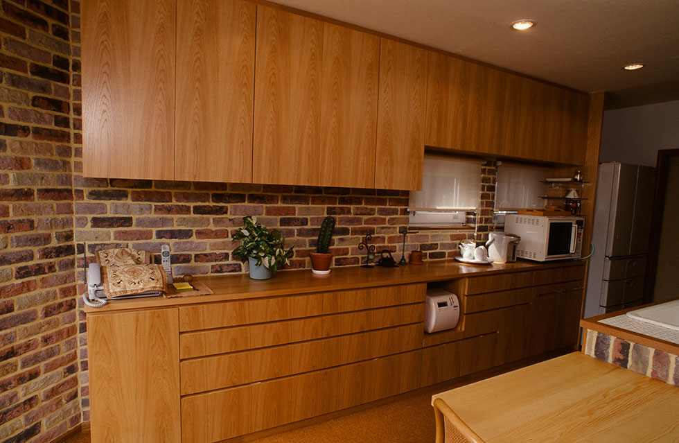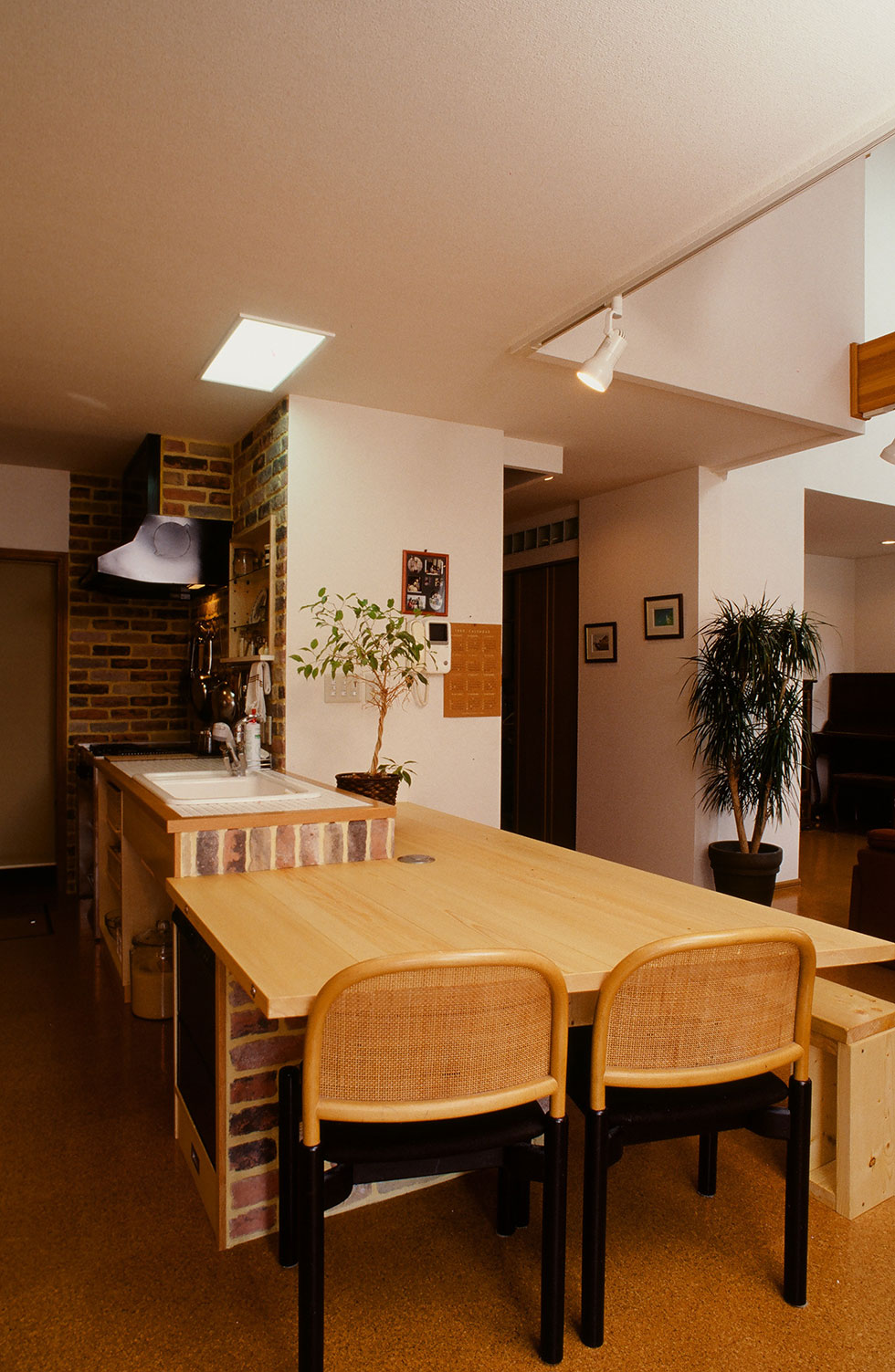 「ここでお料理ができるの!」と、奥さまが思わず感激したという、レンガと木を組み合わせたキッチンは、オープンな造りでリビングとのつながりを自然なものにしています。ダイニングテーブルは、奥さまの好きなパイン材でキッチンをL字で囲むように特注したもの。出来たての料理をカウンターに並べ、ご友人が「レストランのよう」と絶賛する自慢のスペースです。