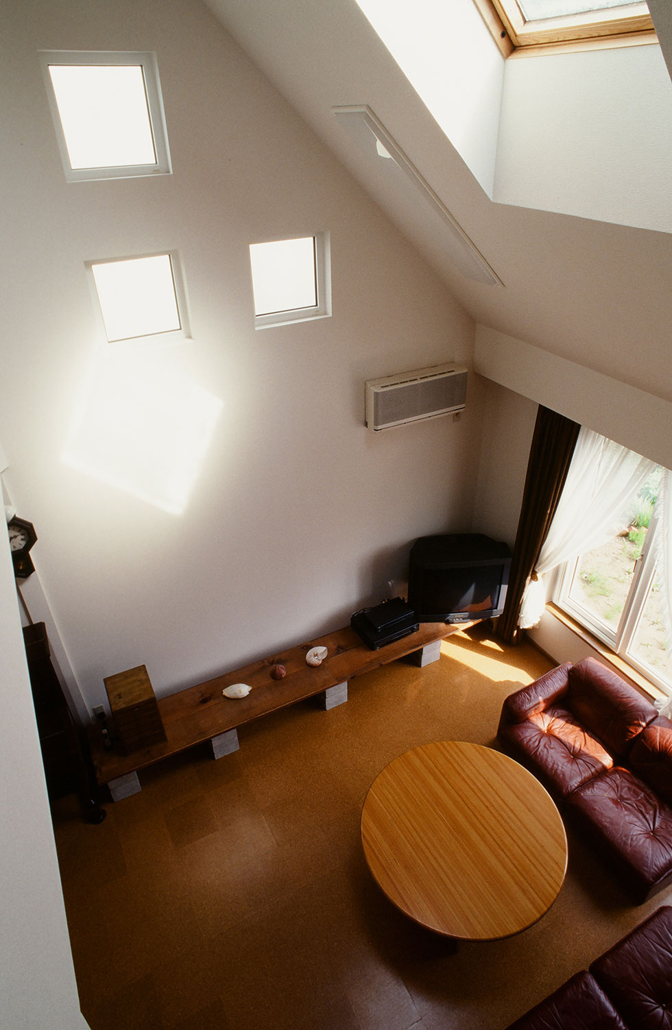 吹き抜けから見た1階リビング。和室の一部をそのままリビングの延長に利用してより広くなりました。窓を増やすことで、悩みだった室内も明るくなっています。デッドスペースも神棚を置くスペースとして利用するなど、空間をできる限り有効に利用しました。