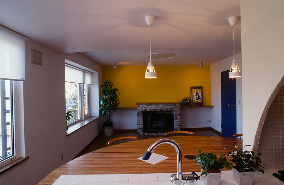 リビングの壁面は、湿度調整の機能性も高く、ナチュラル質感の珪藻土による塗り壁。ドアや壁の一部にはイエローやブルーなどのビビッドなカラーを採用しました。ぬくもりを感じさせる暖炉にあるのは、じつは普通のFFストーブ。「色やデザインなどもすべておまかせでしたが、こんなに素敵になるなんて思いませんでした!」と、Sさまご夫妻にもお喜びいただけました。