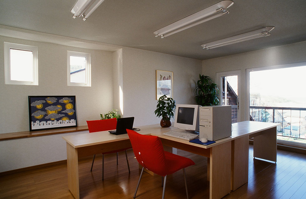 1階にはご夫妻の書斎とWC付きの寝室、そして子ども部屋を設けました。「書斎には、コンピューターを2台置ける特注のデスクを」というリクエストに、大きさと配置で工夫をしています。
