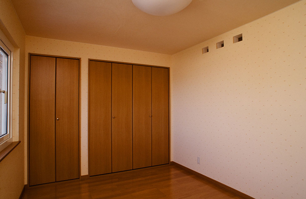 子ども部屋には収納をたっぷりと。キッチンの造作収納なども含めた収納力や使い勝手の良さにもSさまからのご評価をいただいています。写真の右上にあるのは通気口で、クローゼット、そして寝室へと風が流れる設計です。