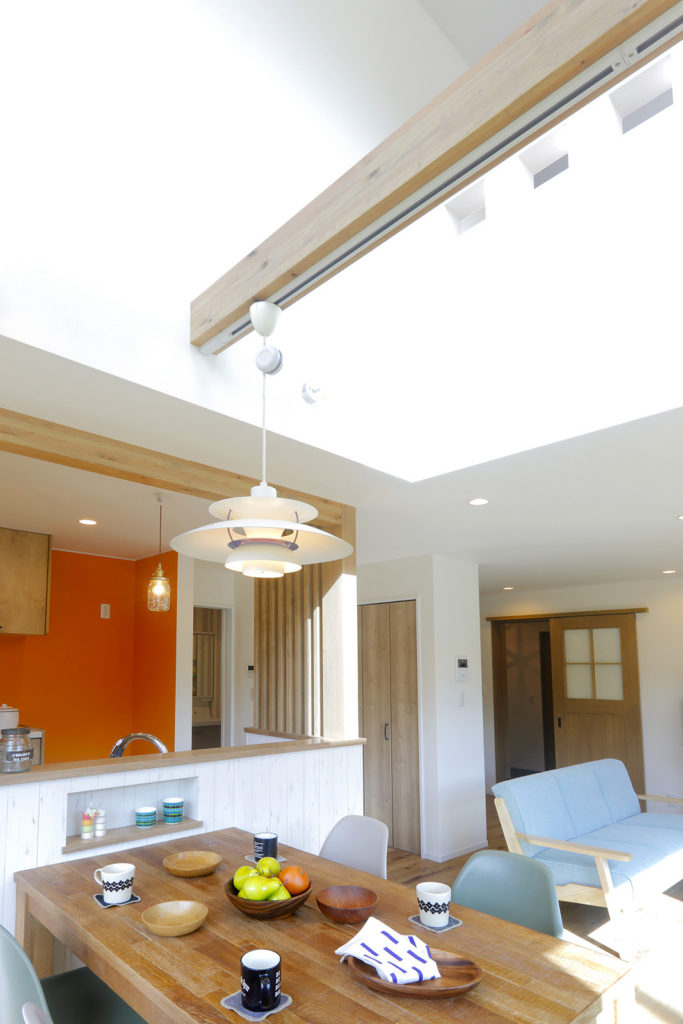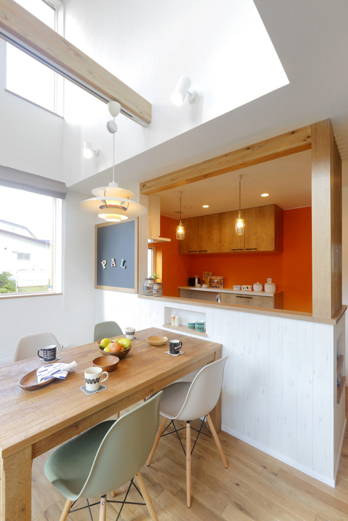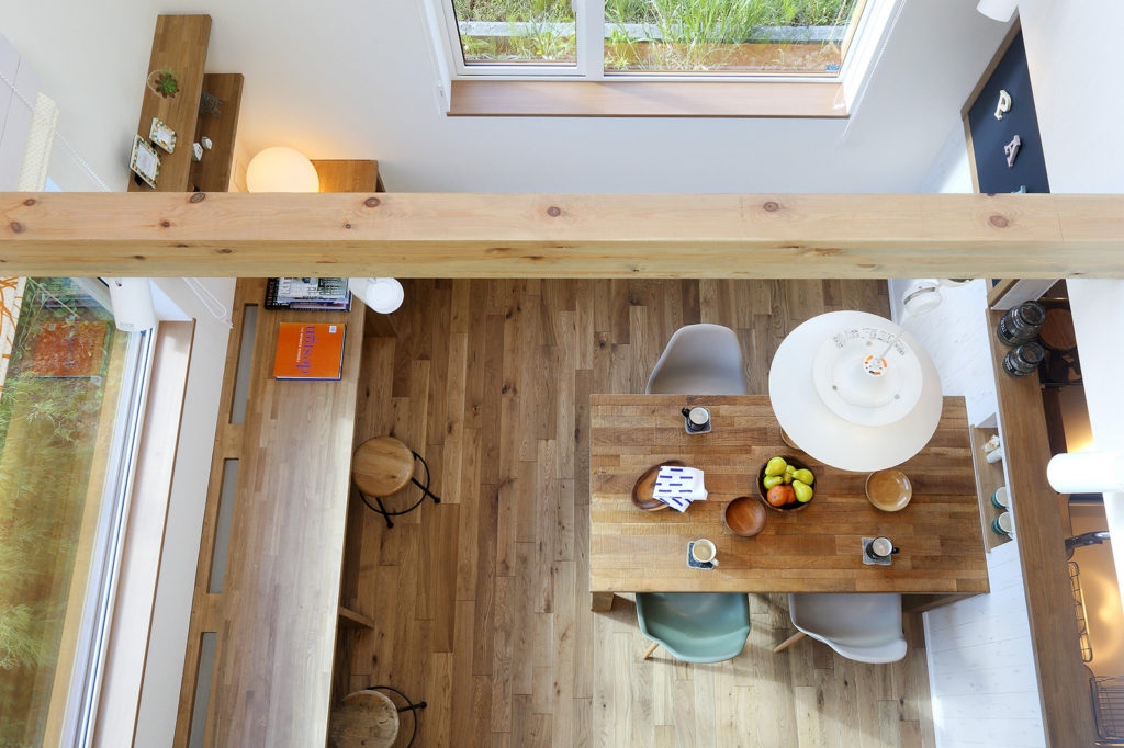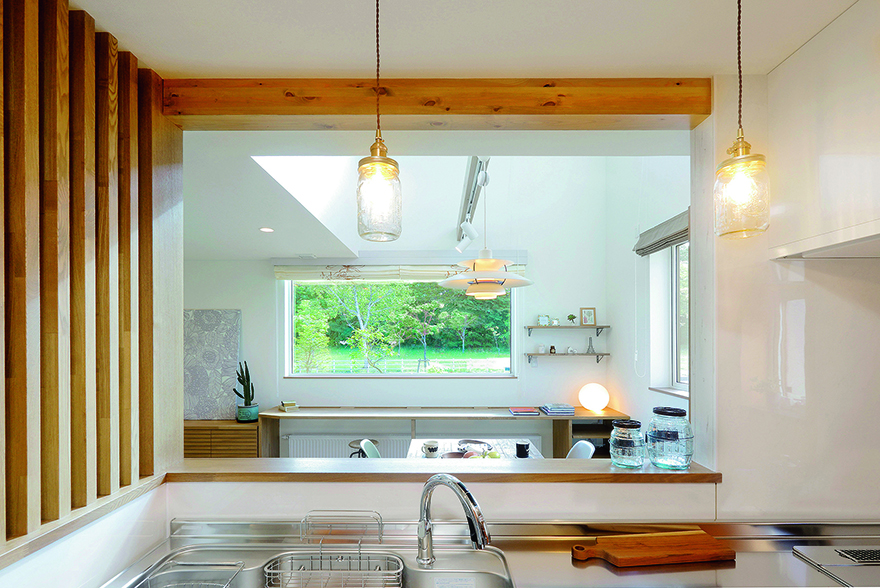 キッチンからは、リビング・ダイニングや窓辺のカウンターで過ごす家族の様子がわかります。さらには、吹き抜けを通して2階フリースペースからも家族の気配が感じられます。
