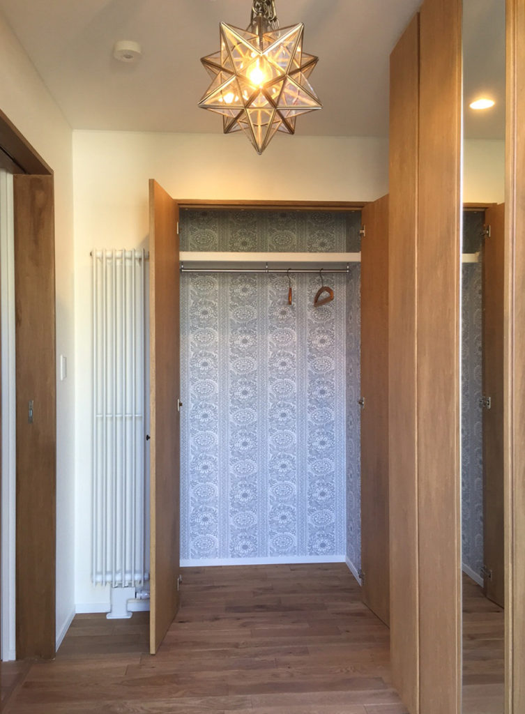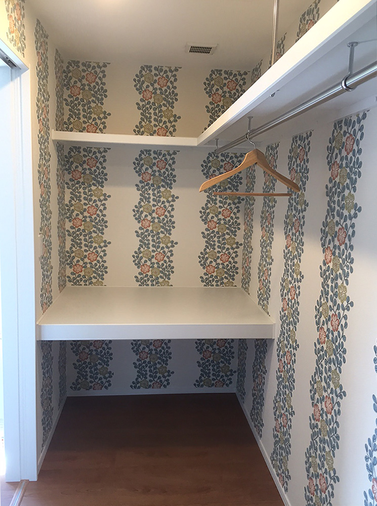 2階主寝室のウォークインクローゼット。壁紙にもこだわっています。