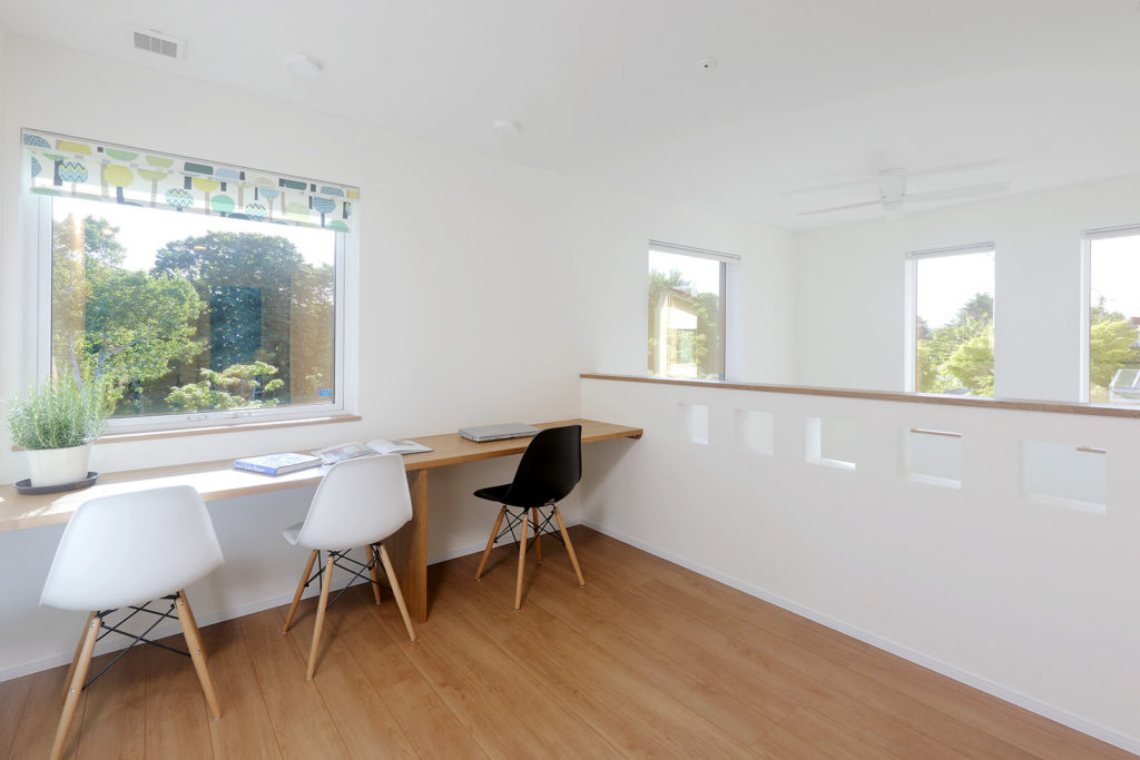 2階吹き抜け横にあるご主人や奥様の自分時間のスペースからも、青々とした緑地が眺められます。