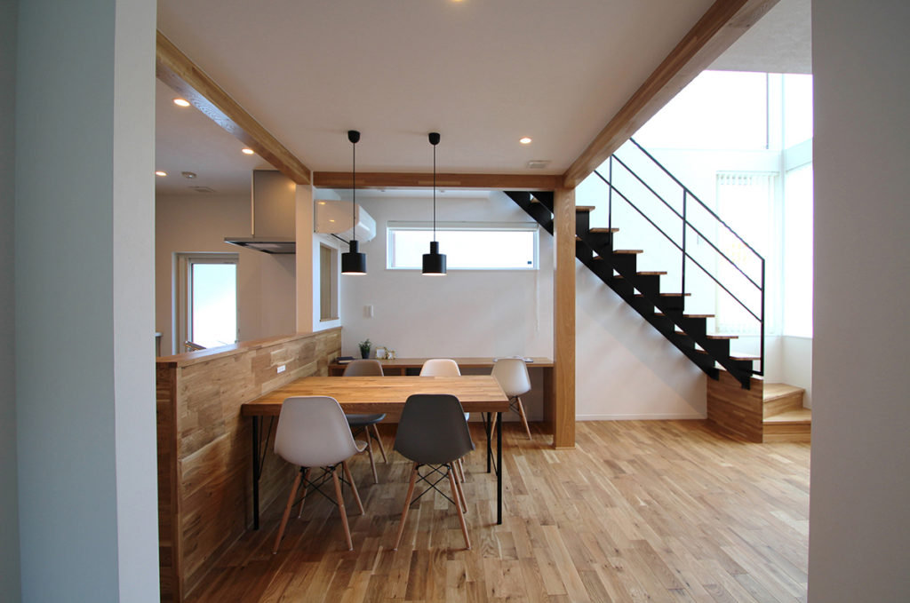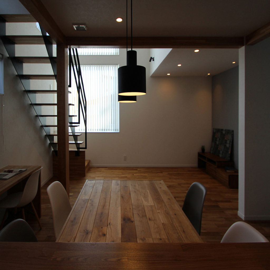モデルハウスのダイニング・ペンダントライトは凸LAMP S16(デコランプS16)を採用。無垢材のナチュラルな空間のアクセントに。