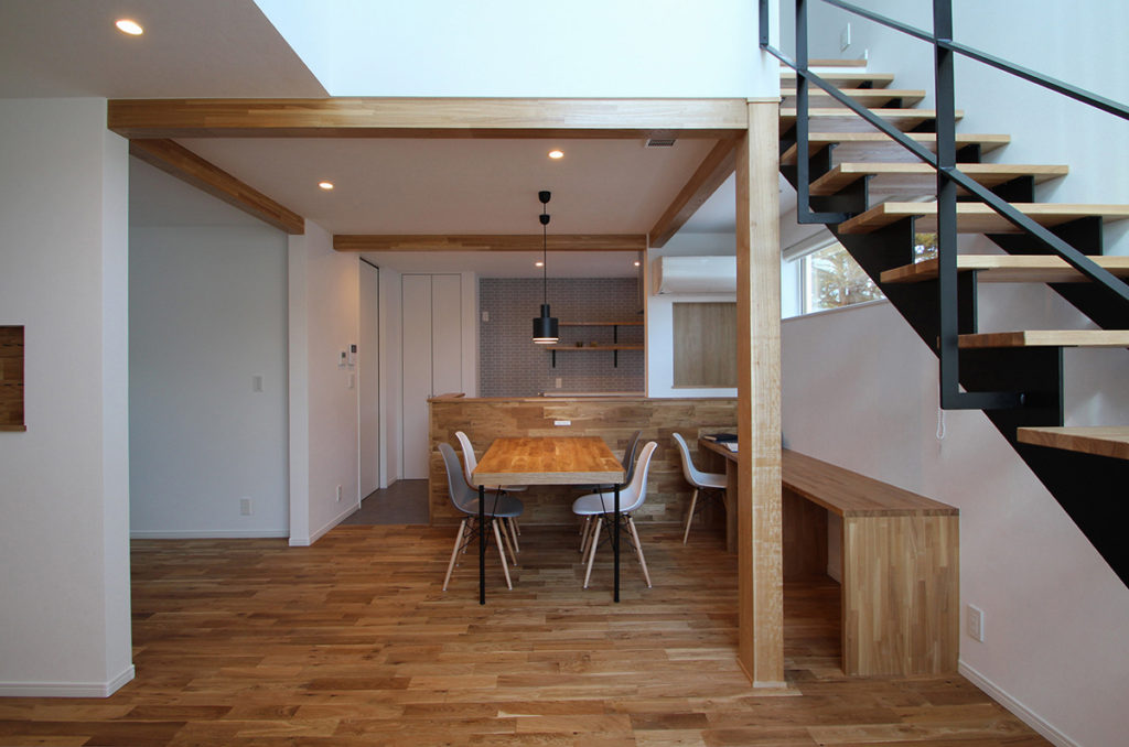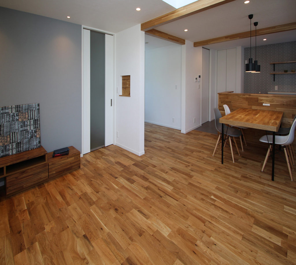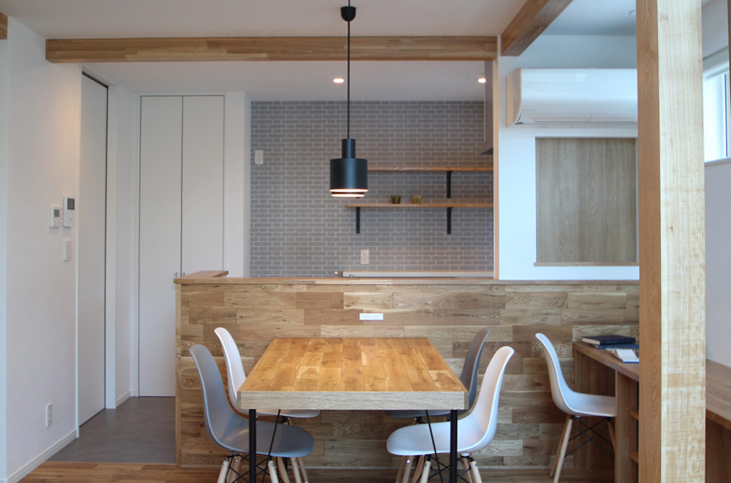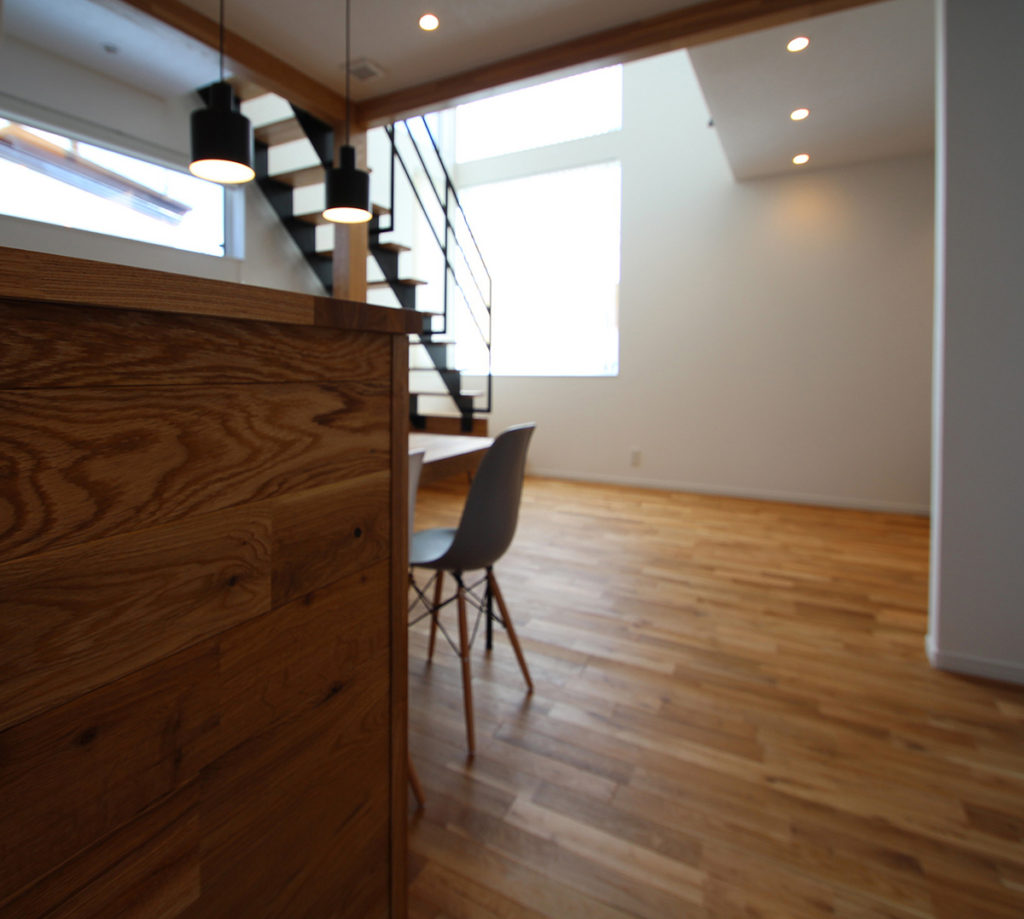 無垢フローリングのリビングダイニング。キッチン腰壁にも無垢材を張り、ナチュラルな印象に。