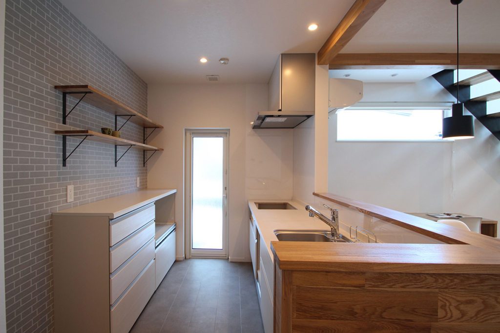 対面式のカウンターキッチンは食器洗い乾燥機付き、キッチン横にはユーティリティがあり、家事のしやすい配置です。キッチンは二人で立って使える広さがあるので、家族で一緒に料理をすることもできます。