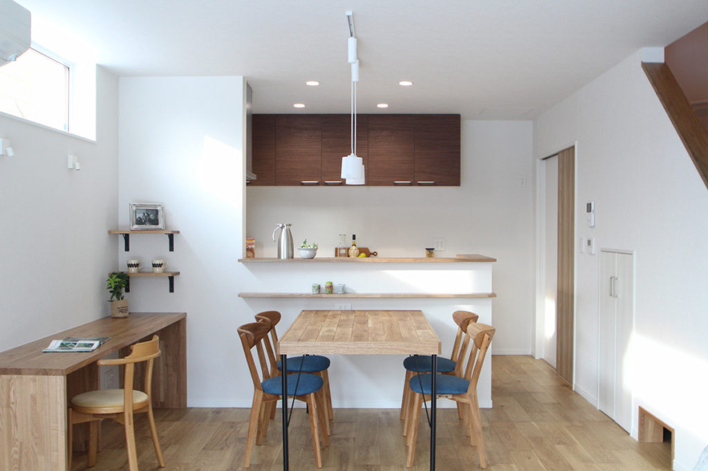 「こんな収納があると身支度に便利」とお施主様が描いたスケッチは、玄関にある家族用収納ロッカーやウォークインシューズクロークとして実現しました。カウンターキッチンや、家族がくつろげるリビングダイニング、1階に3帖の洋室、生活しやすい回遊動線、1階だけではなく2階にもトイレがあるなど、子育て世代にもシニア世代にも暮らしやすい間取りなので長く快適に暮らせます。