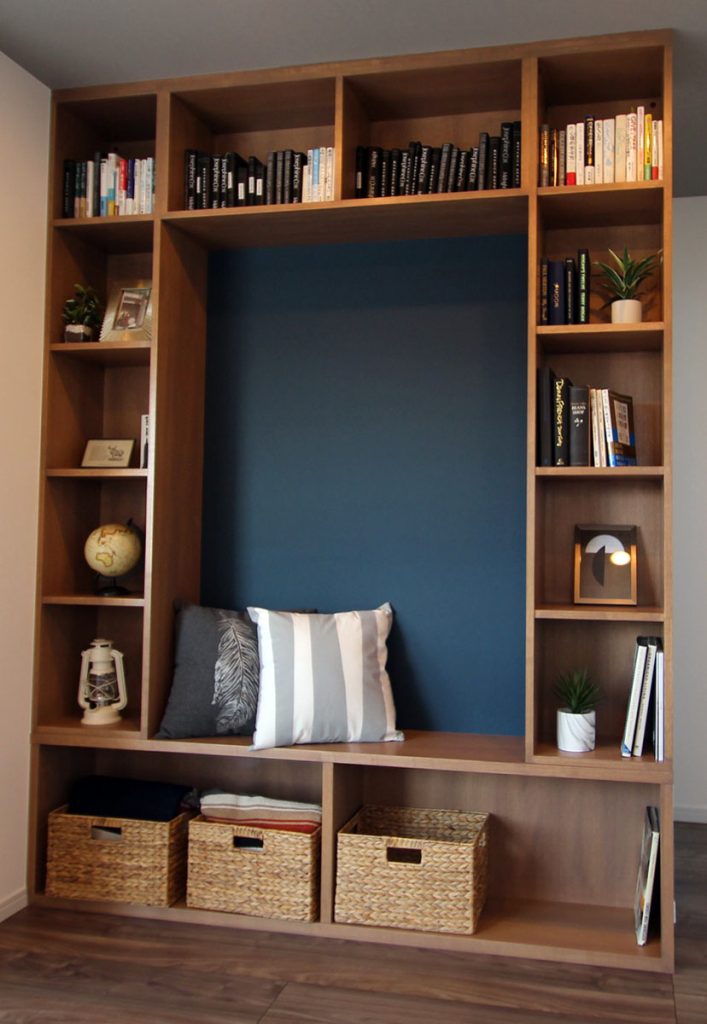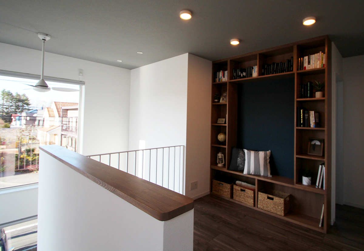 本棚中心に腰を掛け好きな本に囲まれながら読書ができる、まるで図書館の様な空間はお施主様のこだわりの一つです。小物や植物を置いて空間演出をするのも素敵です。