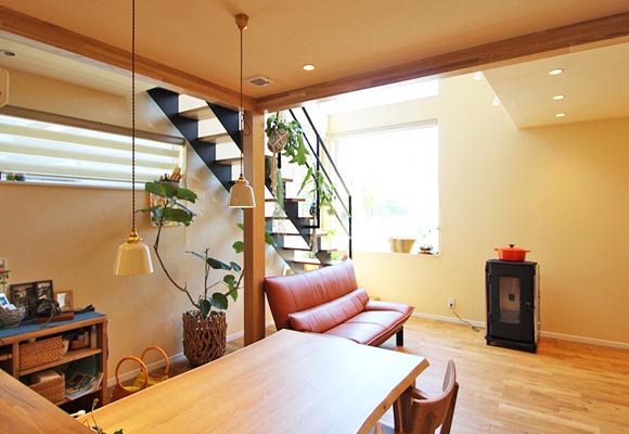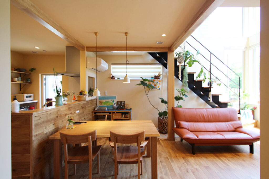 玄関ホールを抜けると広々としたLDKが広がります。東側には1,2階部分に窓を設け部屋全体に光を届けます。ダイニングにある多目的な造作カウンターは、ちょっとした家事をしたり、パソコンを置いたり、本棚として使ったり、様々な用途で使える便利なスペース。