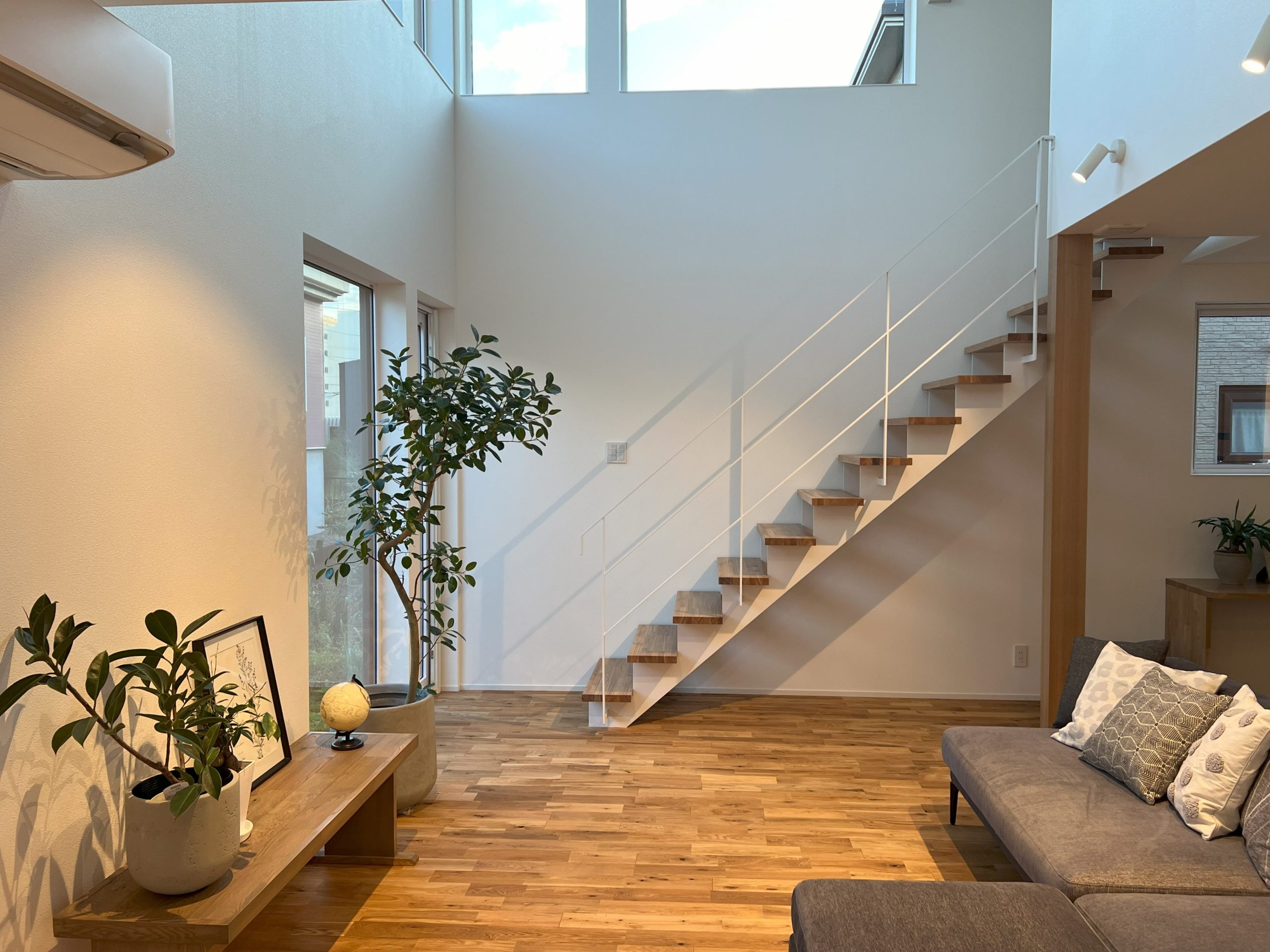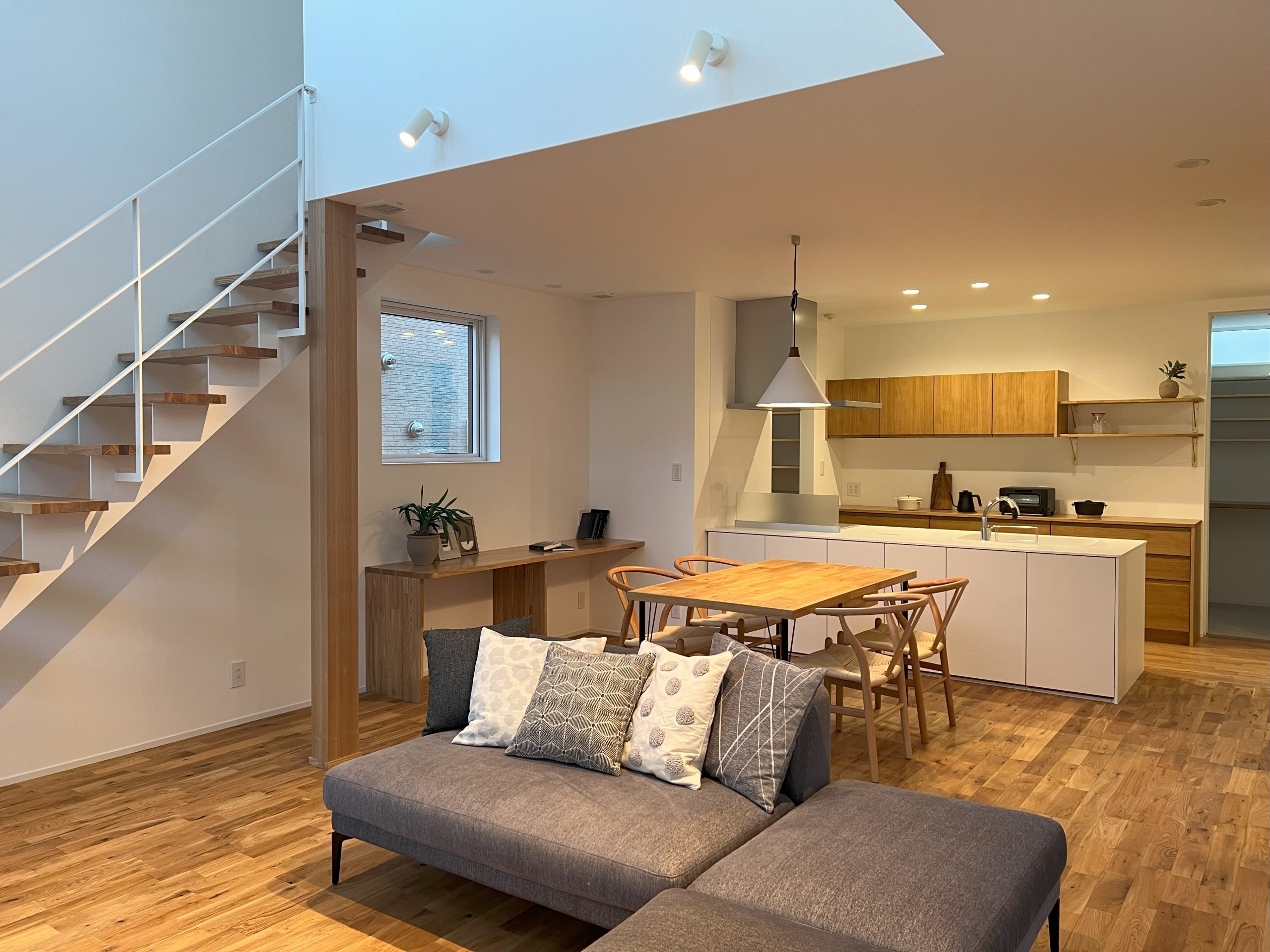 22畳の広いLDKは、毎日の家族の時間にぴったりの場所です。こだわり設計のスケルトン階段を含め7畳の吹抜け空間は、ソファから見上げると青空が広がり、雲が流れ、ゆったり豊かな時間が流れます。リラックスタイムや家族の会話が自然と弾む、そんな居心地の良い空間がここにはあります。