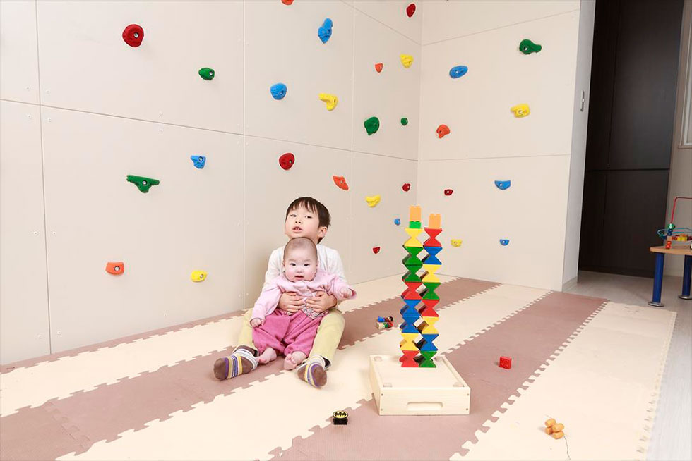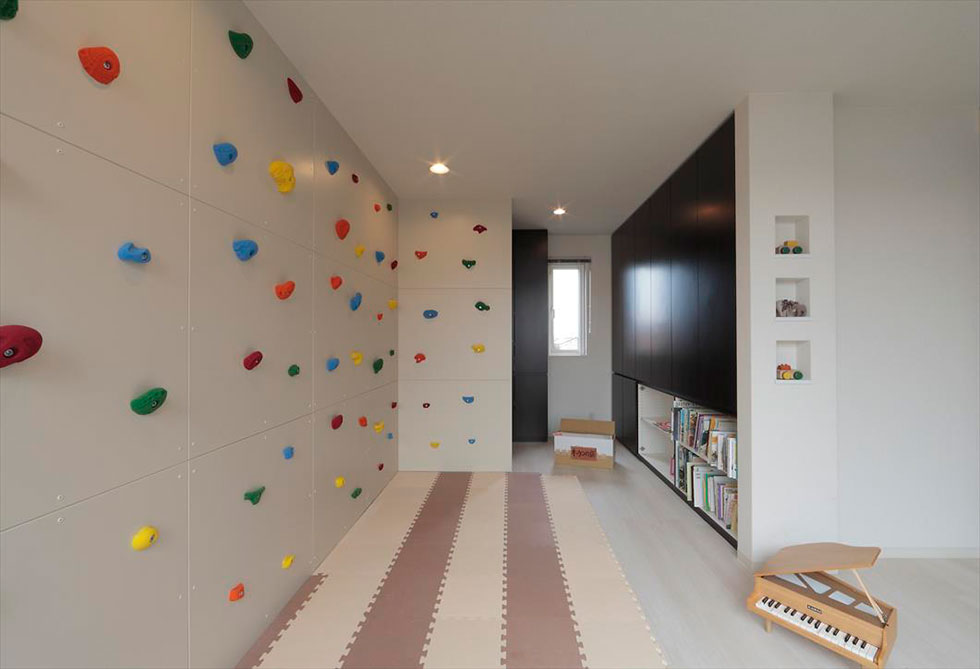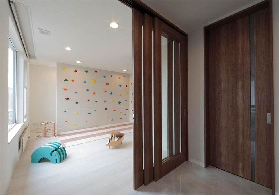 打ち合わせをしているなかで、「部屋の窓から西日が当たってとても暑くなる」というお悩みがあったため、窓との間にクライミングウォールの間仕切り壁を設けました。お子さまが楽しく遊ぶ壁の後ろは、物置などの収納に利用もできます。