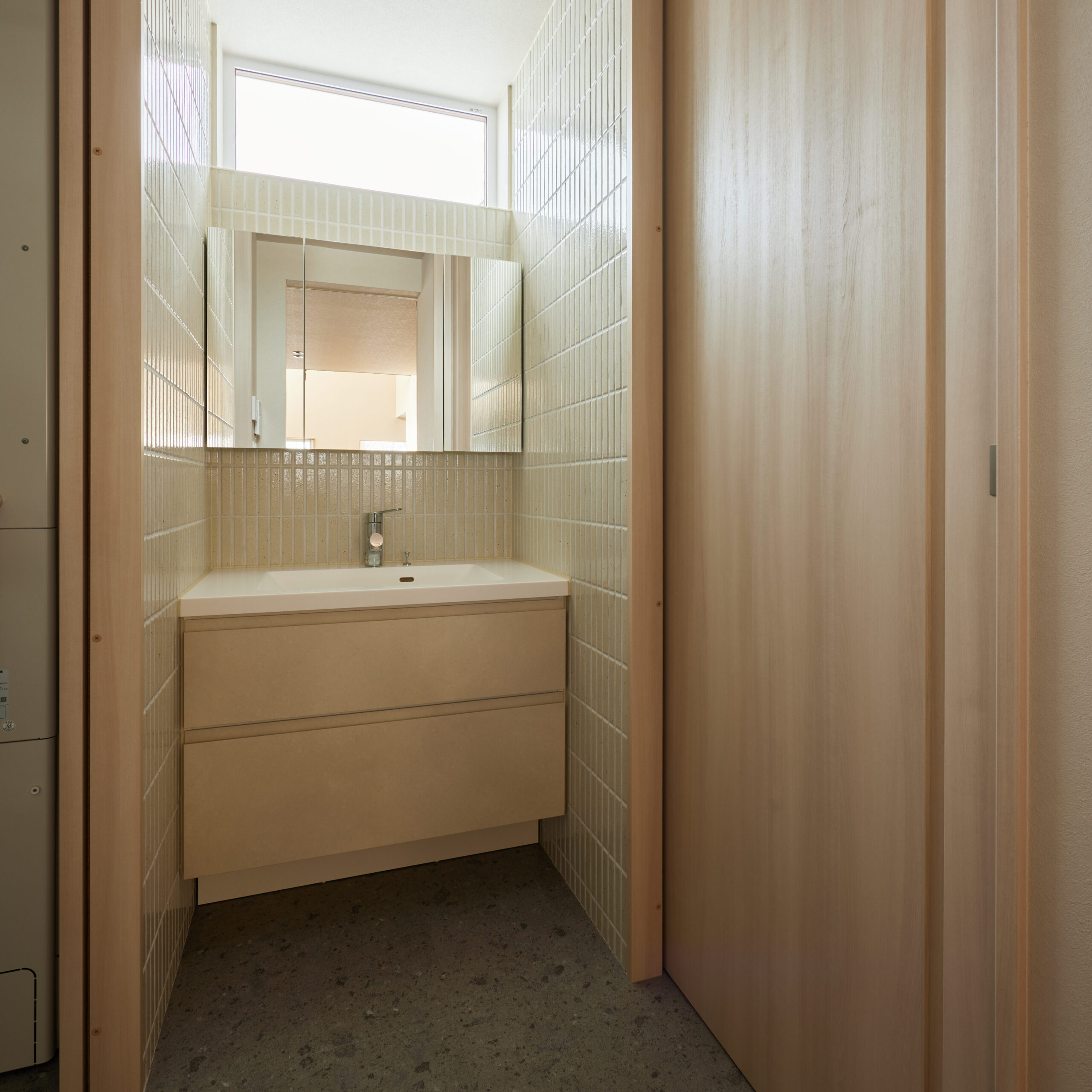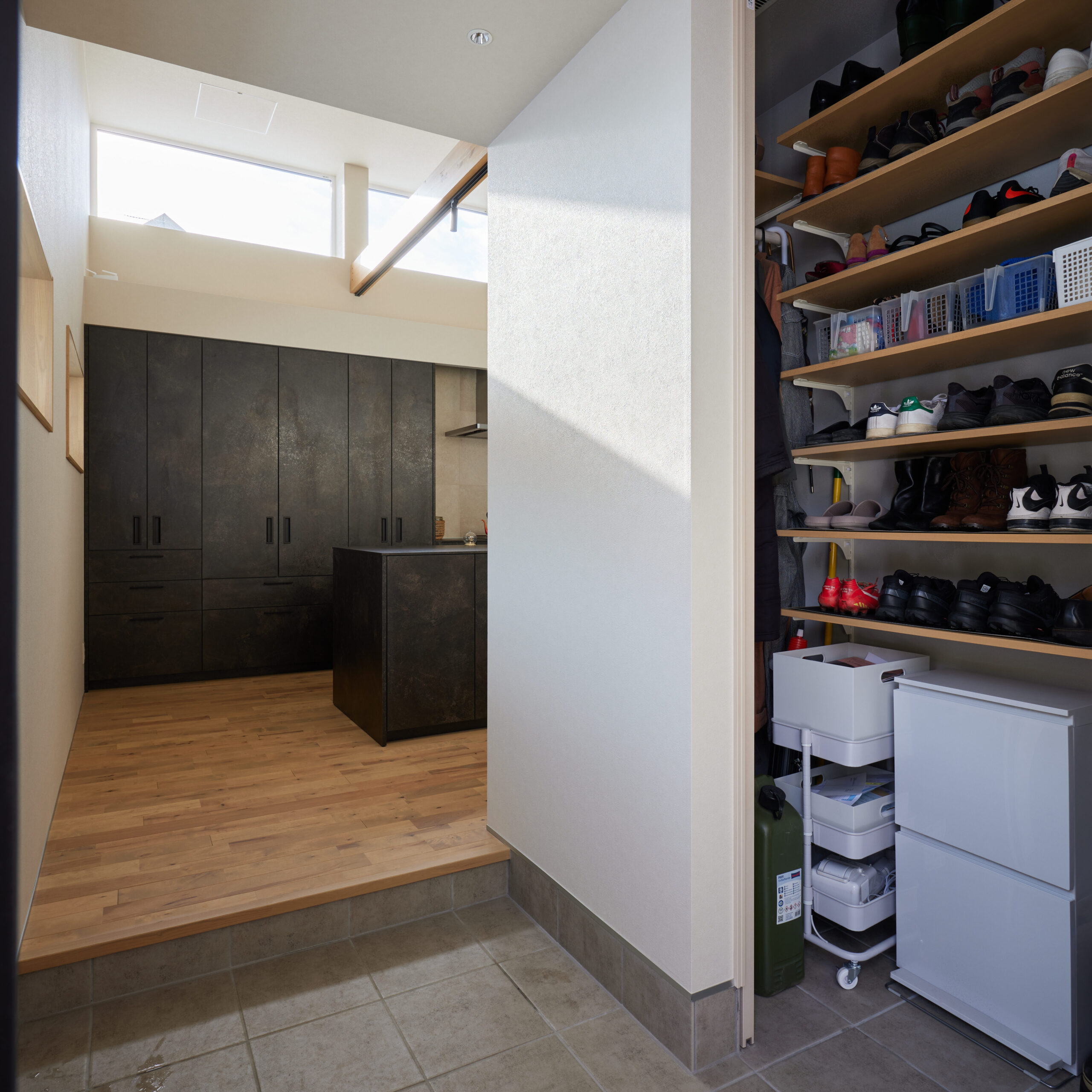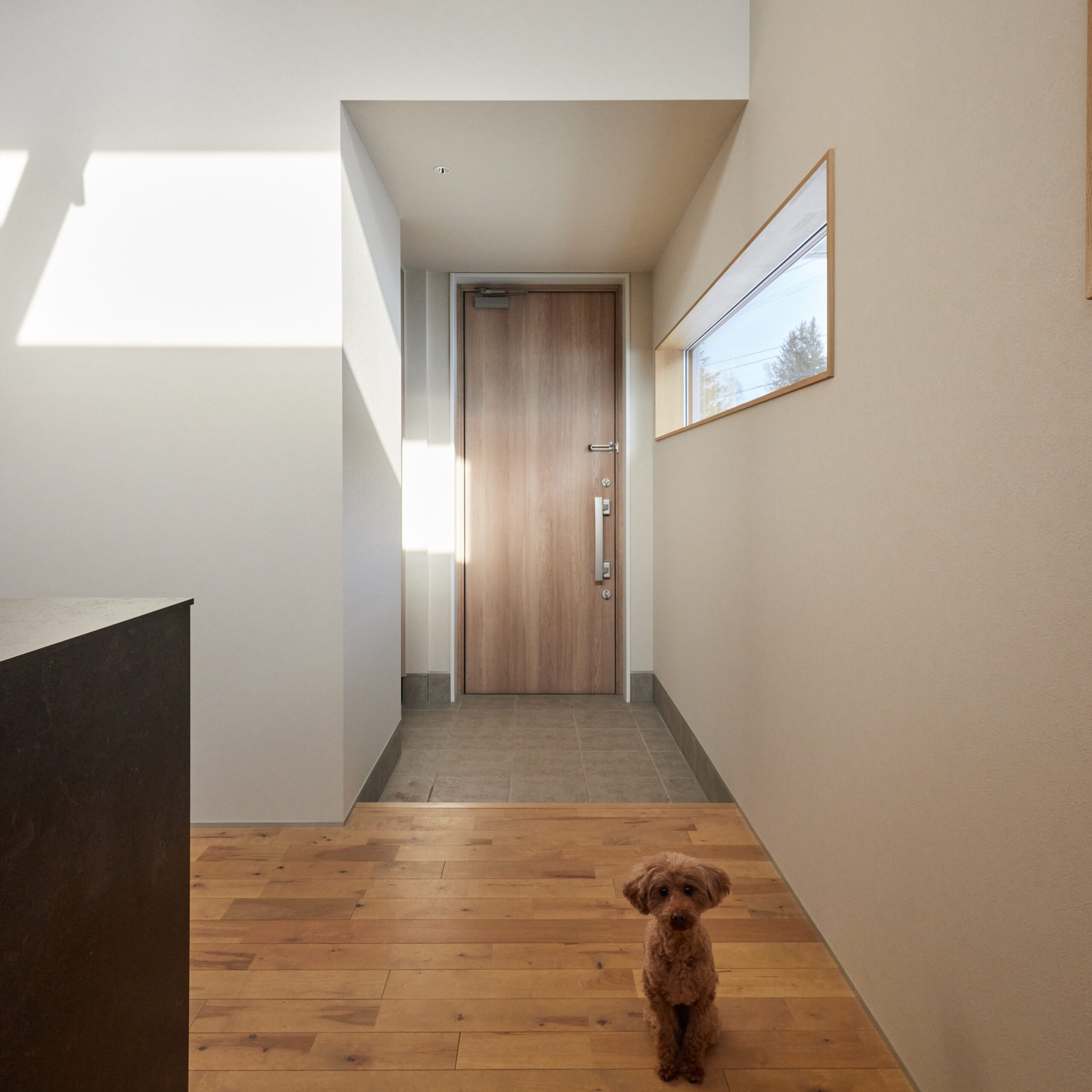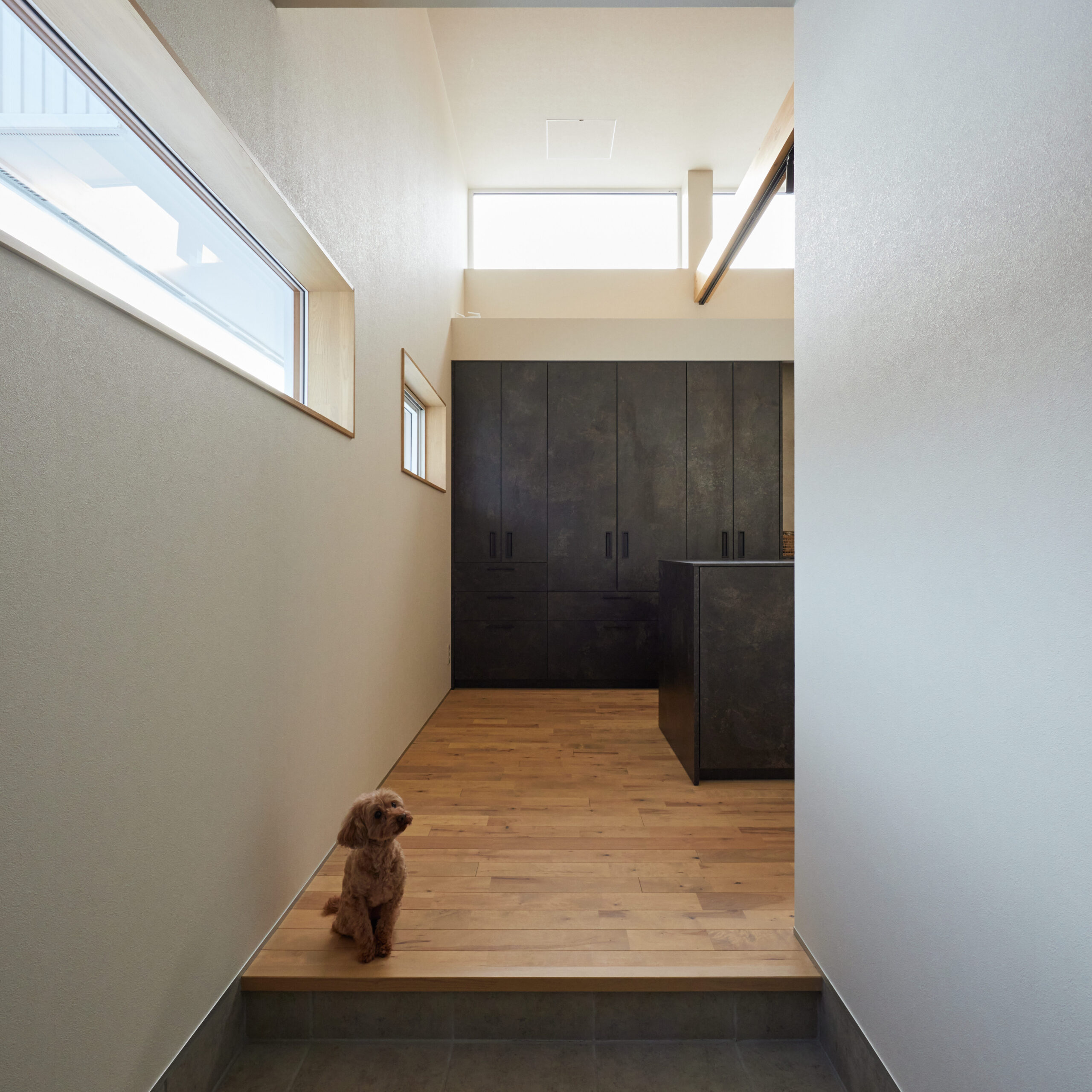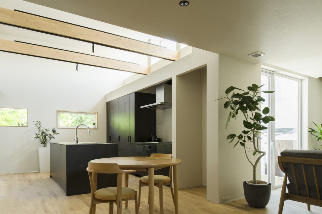 玄関入ってすぐのキッチンスペースは平屋でありながら天井は3600くらいにして吹抜け感を出し、目線が全くきにならない場所に光をいれるためのハイサイド窓を設置して気持ちの良い光源で木漏れ日感を演出。