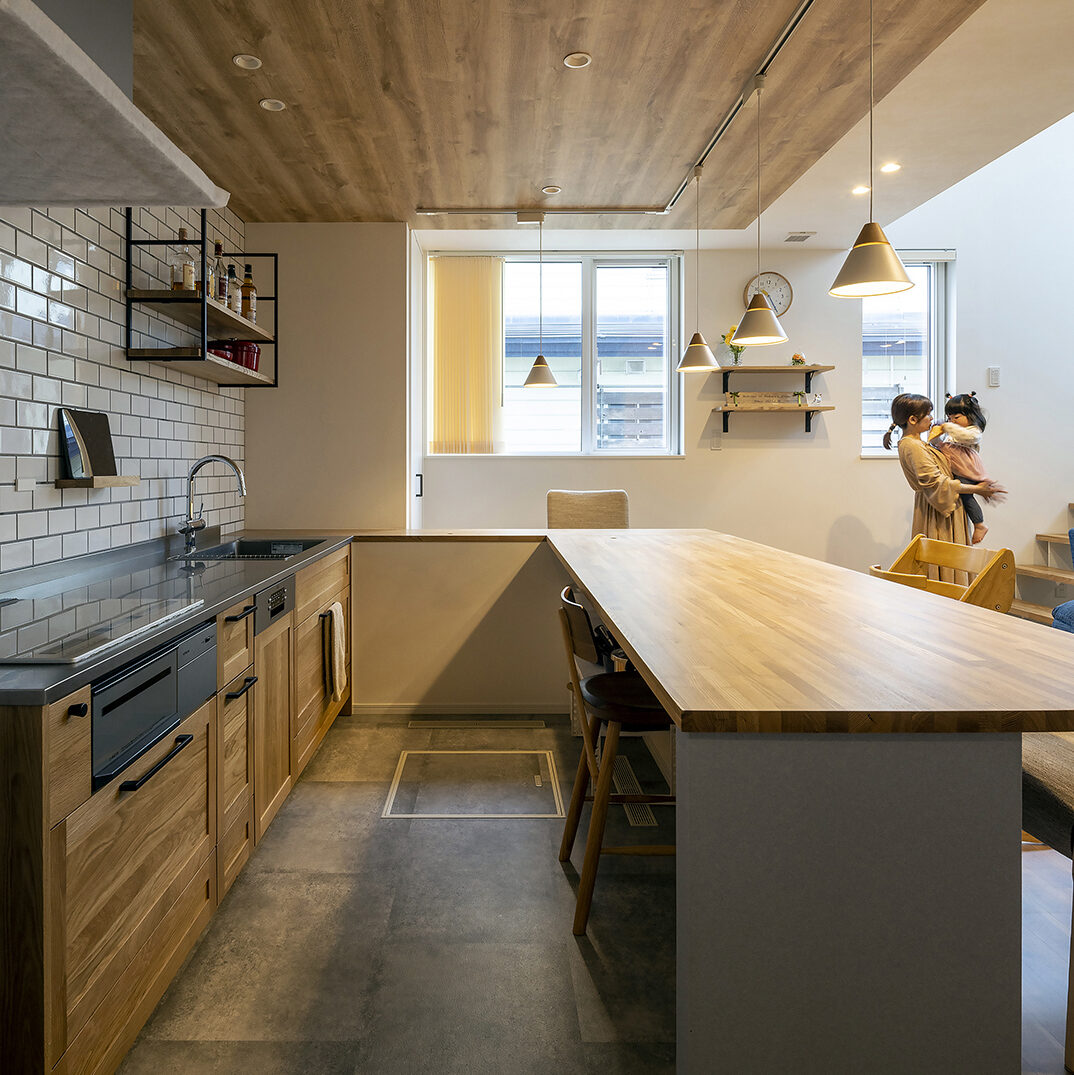 一番のこだわりはキッチンです。料理好きのご主人が長年思い描いていた理想を、どう形にするかが設計の鍵となりました。特注で完成したのは、ダイニング兼用の奥行きが75cmある広いL字カウンターを備えたコの字のオープンキッチンです。