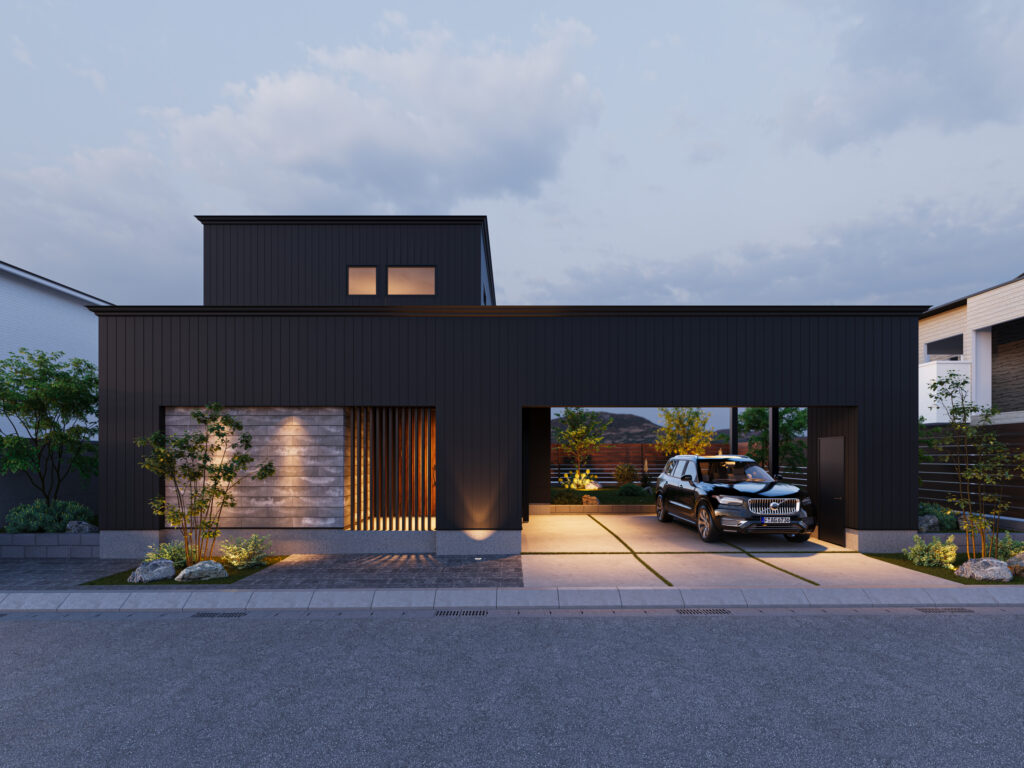 夜になると、外壁の陰影と植栽のあかりがやわらかく灯り、静かに「おかえり」を告げてくれる。