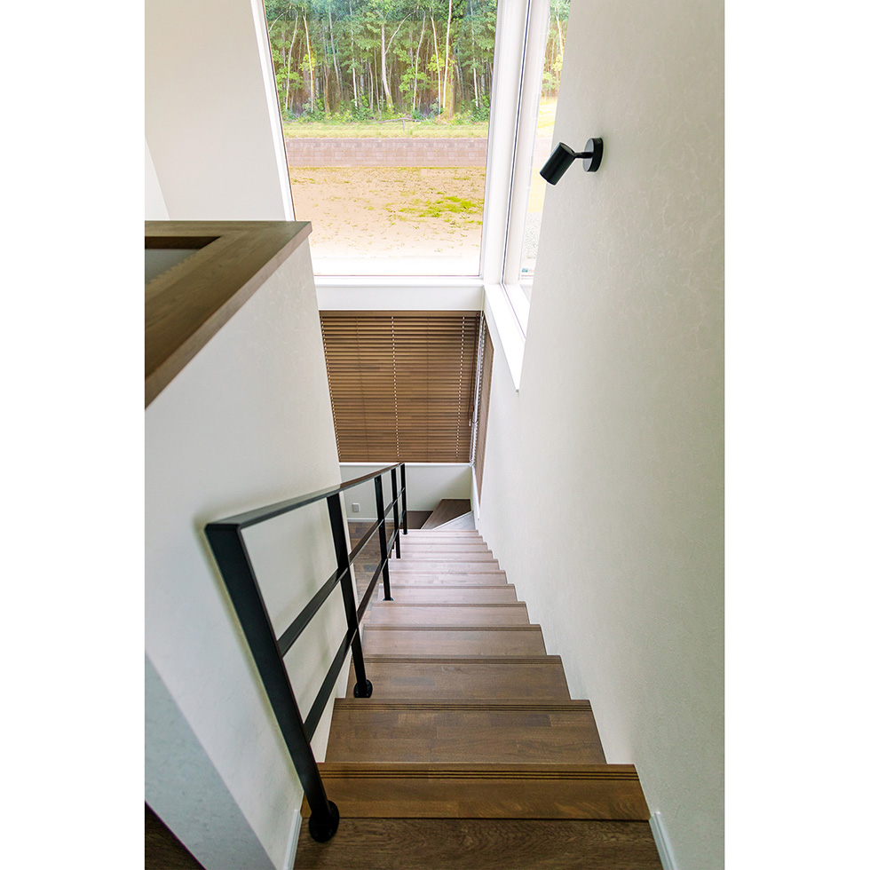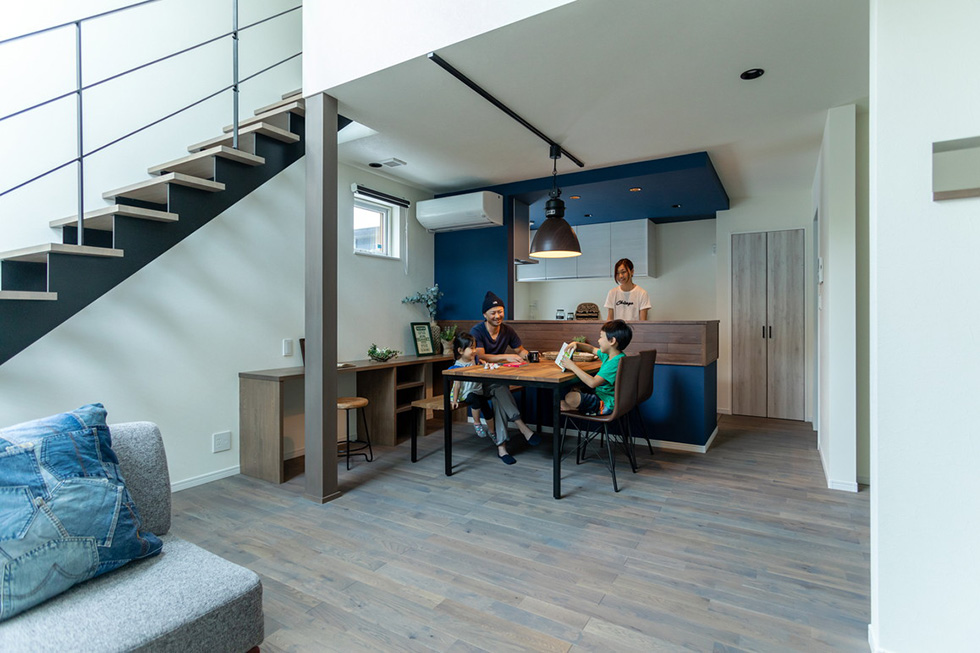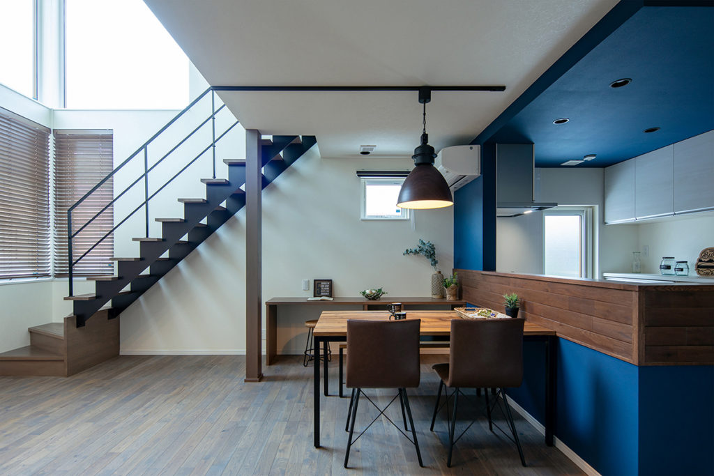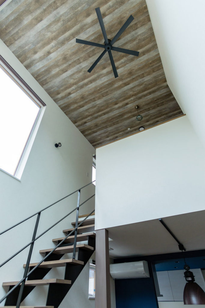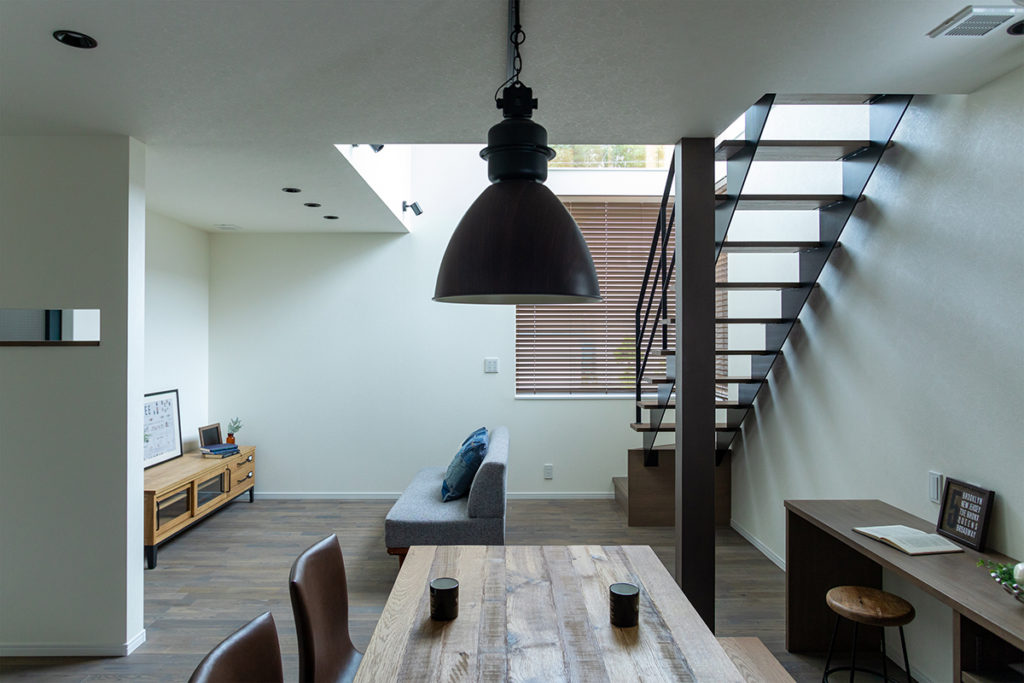 リビングに鉄骨のオープン階段と一体の吹き抜けを作り、開放感を演出。