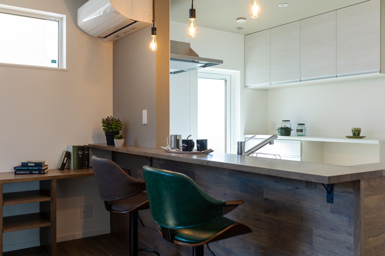 カウンターテーブルは朝ご飯のサーブや片づけなどがしやすく、夜にはゆっくりお酒を楽しむことも出来、暮らしに彩を与えてくれます。腰壁にはタモの集成材を使用。無垢材の風合いが上質な空間に。革張り風のカウンター・チェアもインテリアにマッチしています。