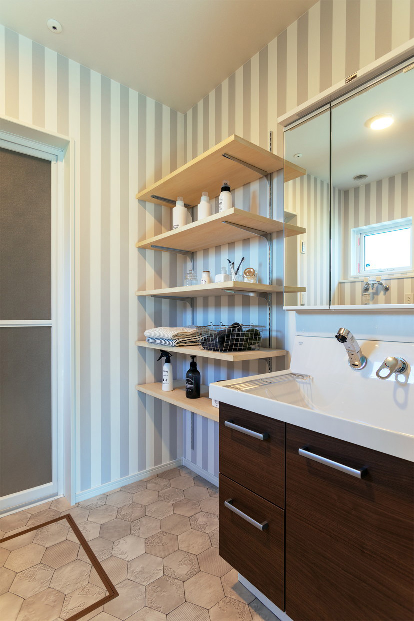 ユーティリティーはストライプ柄の壁紙に、ハニカム柄のテラコッタ風クッションフロアを合わせました。タオルや洗剤の収納に便利な可動式の収納棚も付いています。