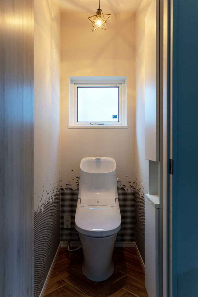 トイレは、まるで千鳥格子が散りばめられたような壁紙が印象的。ヘリンボーンのクッションフロアに星型のペンダントライトで、西海岸風に仕上がりました。