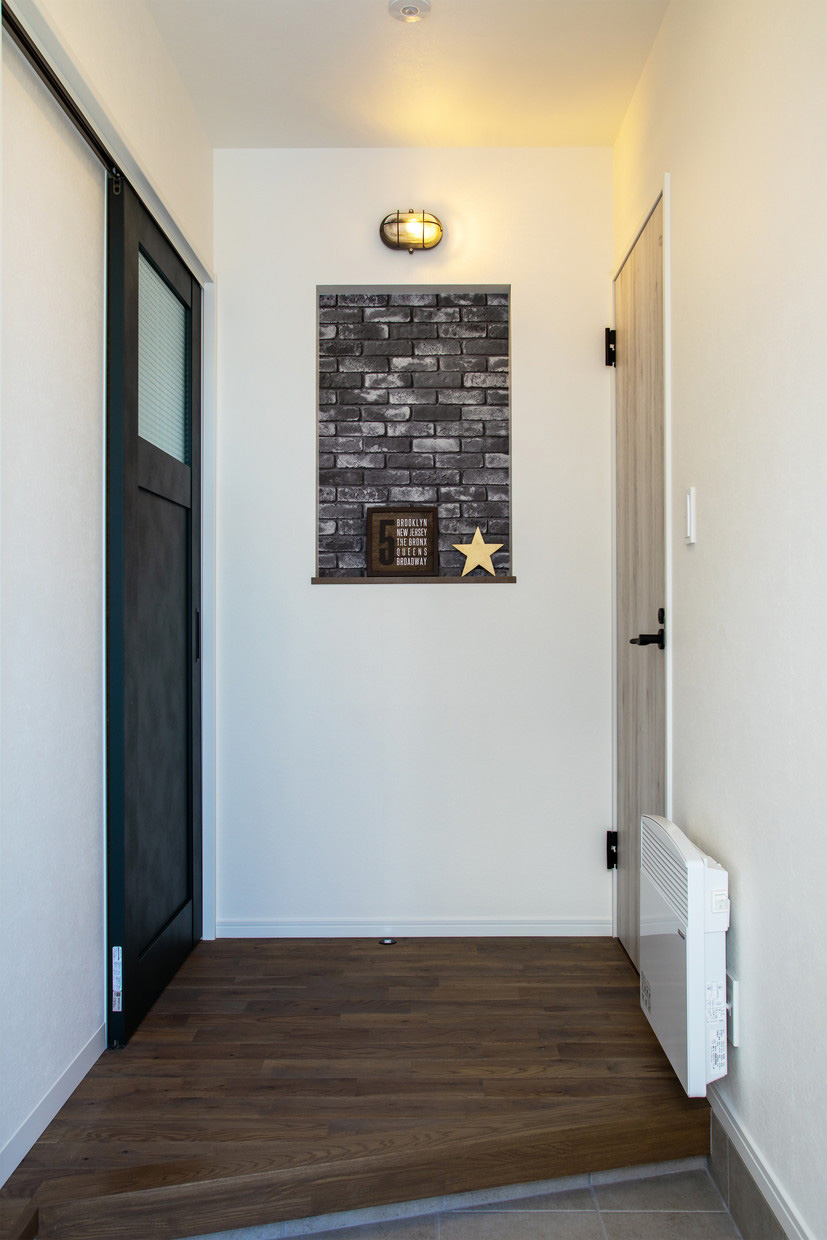玄関はブルックリン・スタイル。マリンランプ風の照明と、ニッチに使ったレンガ風の壁紙が良いアクセントになっています。
