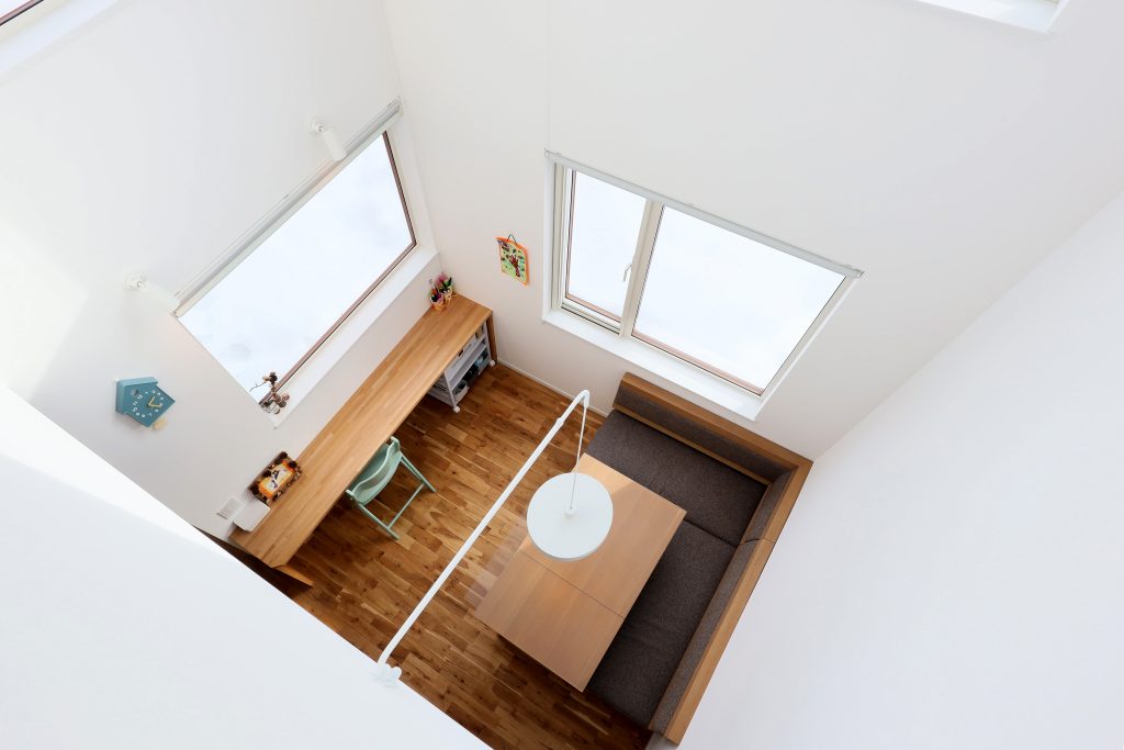吹抜けと大きな連窓によって開放感あふれる空間となるよう計画。