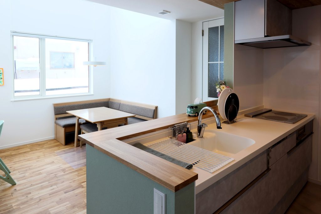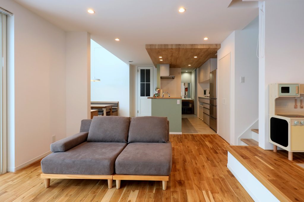 そのご希望と、Iさまがもともとお持ちのL字型のベンチが特徴のダイニングセットが収まるダイニングスペースを中心に日の入り方なども加味して考えていきました。