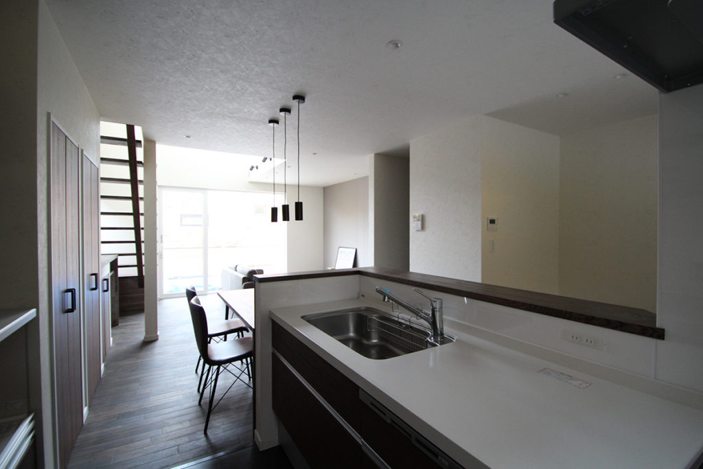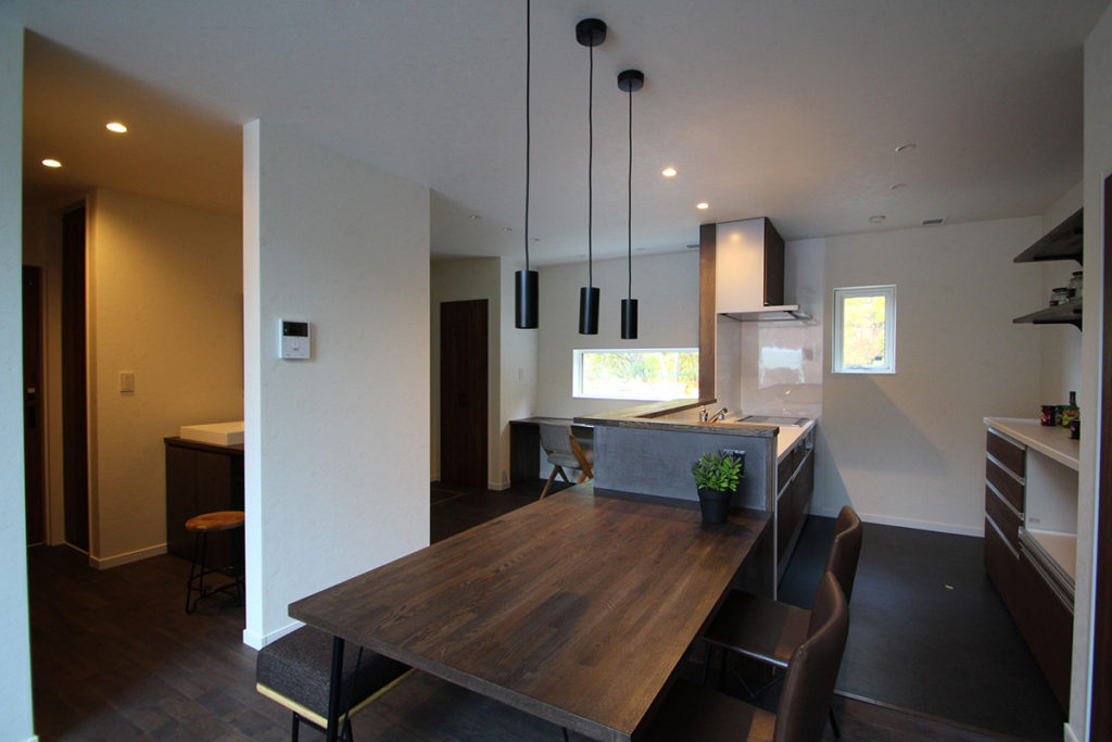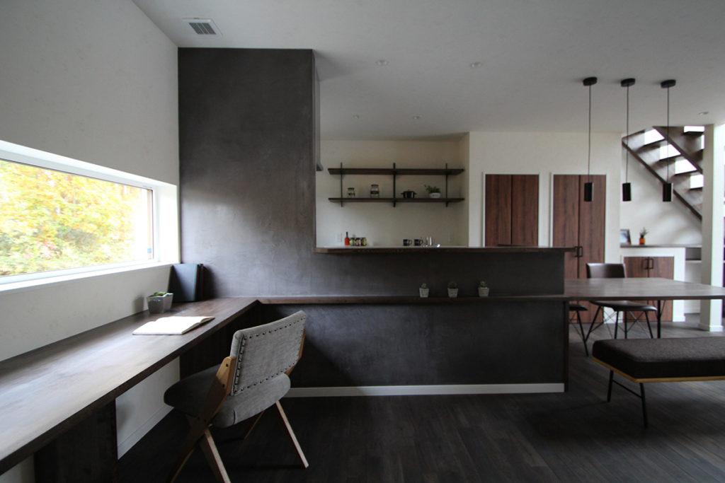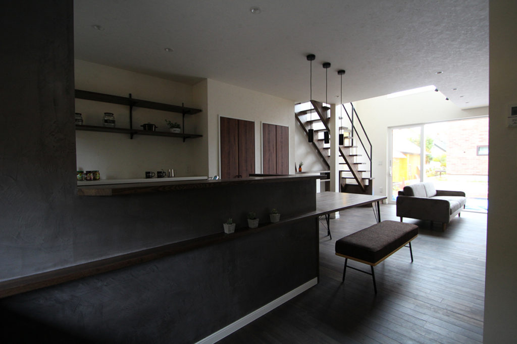 オリジナルデザインのキッチンカウンターと一体になった造作・木ダイニングテーブルや、スタディカウンター、アイアンの手すり付き木製階段など、オリジナリティ溢れる落ち着いたインテリアです。
