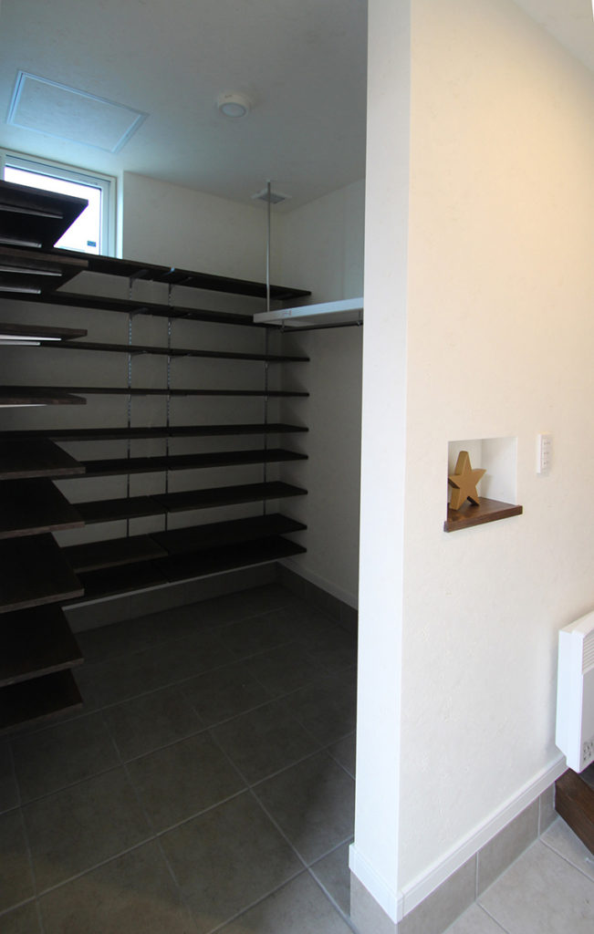 リビングやダイニングにも収納があり、家族の大容量クローゼットや各部屋に収納を配置するなど、適材適所のたっぷり収納で、家事が楽になり暮らしやすい動線。