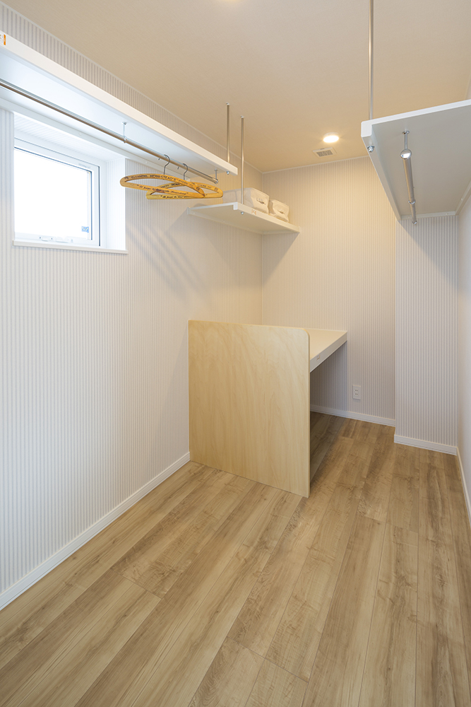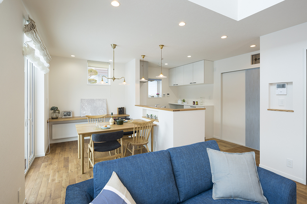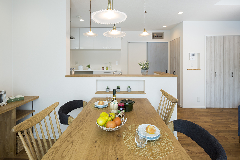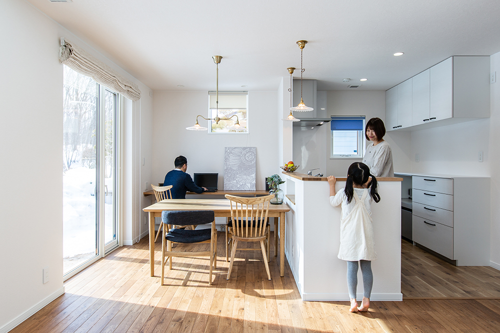 ダイニング横にあるカウンターは、旦那様のパソコンスペースになったり、お子さんのお絵かきスペースになったりと多目的に利用でき、家族が同じ空間で過ごしながら、思い思いに過ごせる広々としたリビングダイニングです。