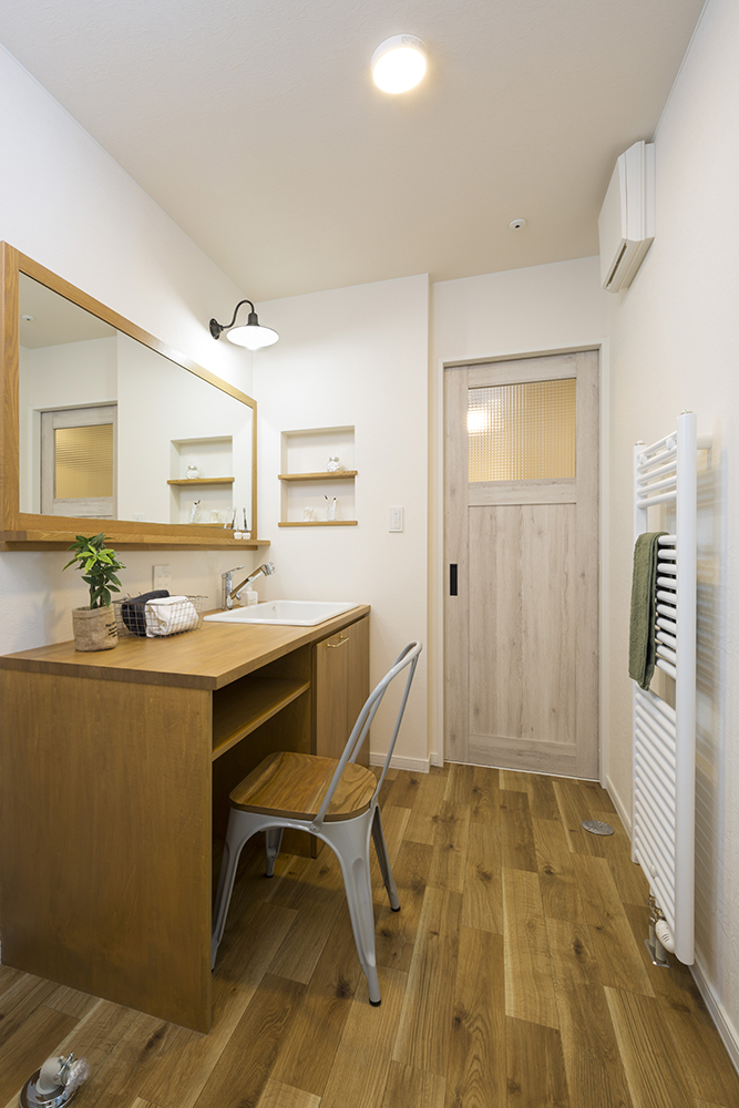 造作の洗面化粧台は、2人で同時に使える広さや、大きな鏡があり、忙しい朝にも大活躍。