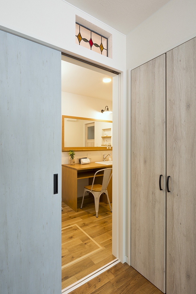 リビングとユーティリティーの間仕切りには、Kさまが選んだステンドグラス、無垢フローリングや木製家具、ウッドカウンターなどの木の風合い、ゴールドの金具とガラスシェードでフレンチテイストなペンダント照明、窓際がすっきり見えるシェードカーテンなどトータルコーディネートされたナチュラルアンティークなインテリアに。