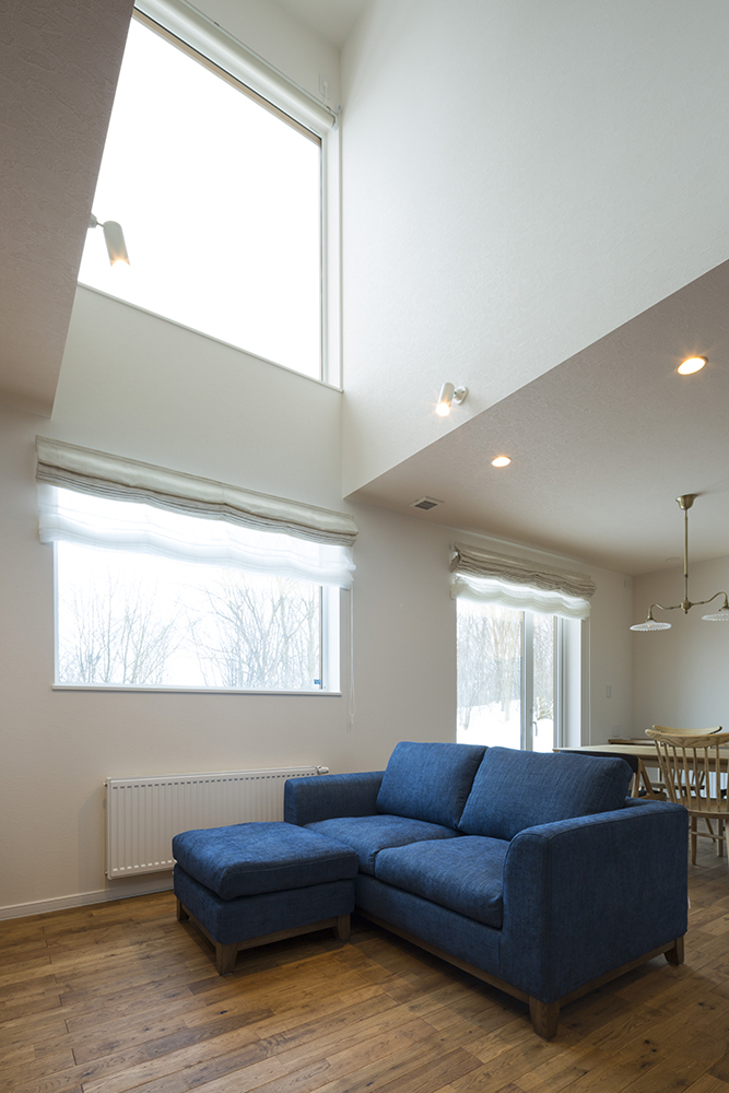 吹き抜けのあるリビングは、眺望の良い庭や緑地の借景を眺められる寛ぎの空間に。