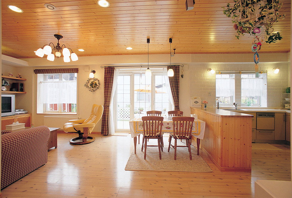 室内には明るい色のパイン材を張り木の温もりがあふれる欧風の空間に仕上がっています。リビングのウッドデッキからはガーデンにも出ることができ、緩やかに内と外をつないでいます。