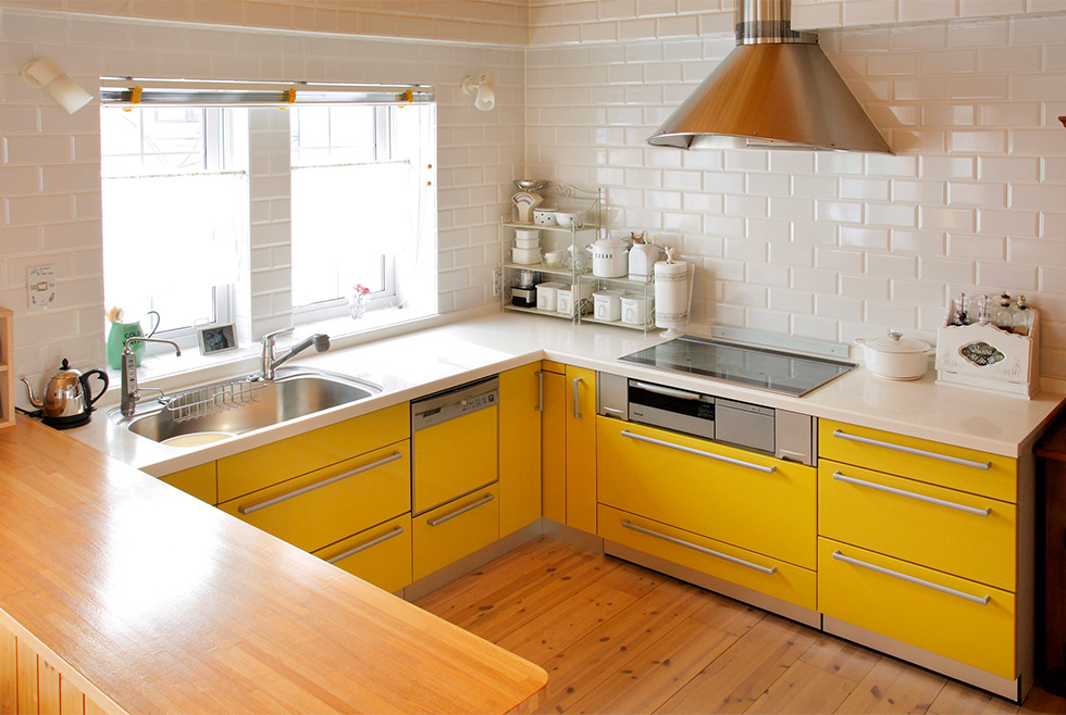 コの字型になった動きやすいキッチン。ご趣味がガーデニングという奥さまのために、キッチンからガーデンの草花が見えるように窓を設計しました。