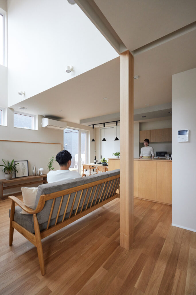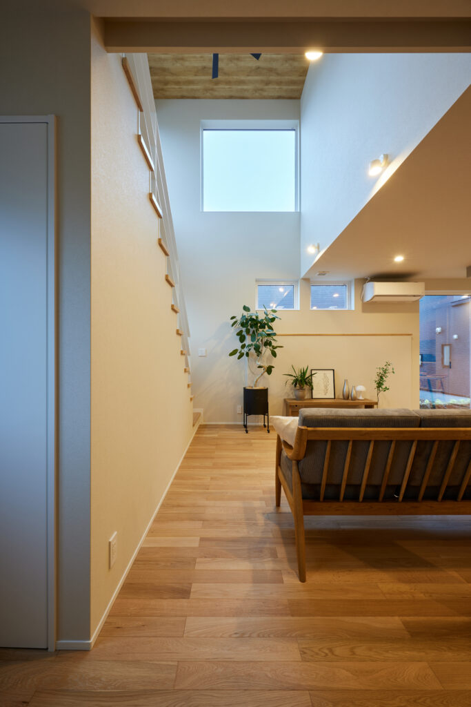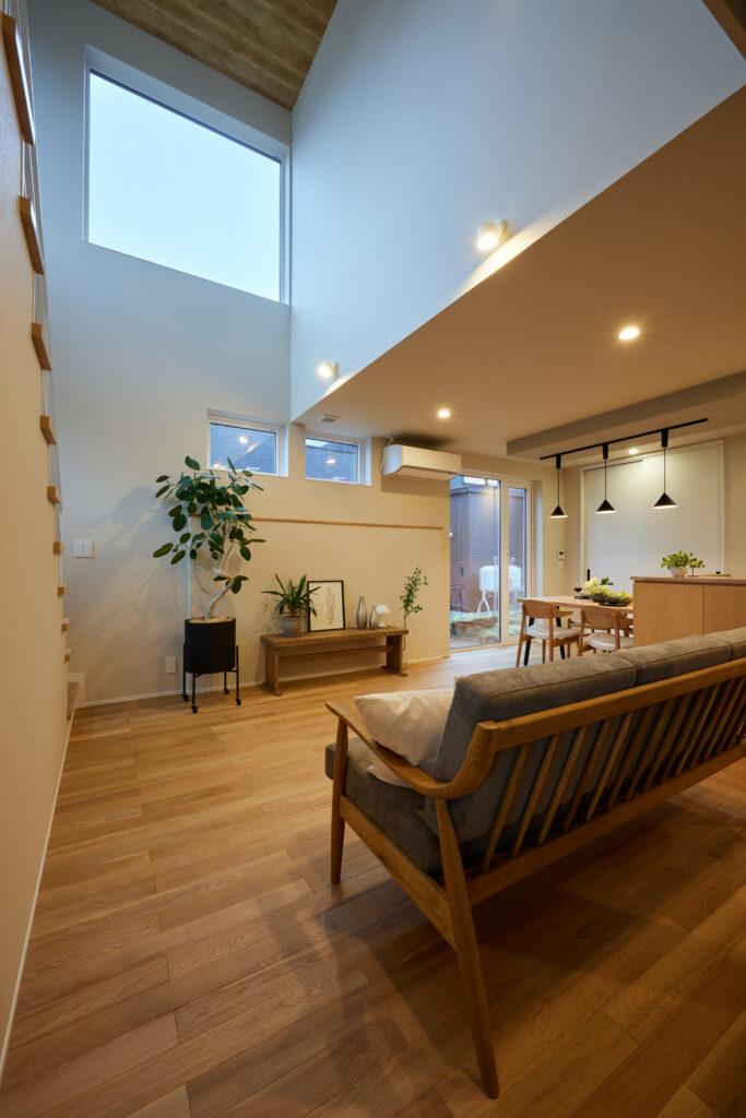 限られた延床面積(約31坪)ながらも、リビングに大胆な吹き抜けを設けることで、視線が抜けて空間の広がりを演出。南側からの光をたっぷり取り込むことで、明るく開放的なリビングとなりました。