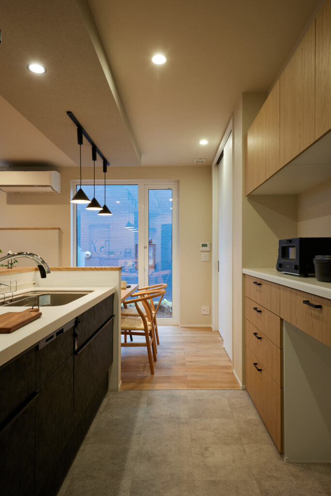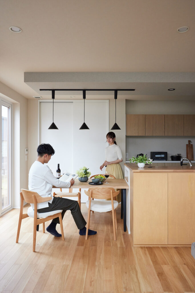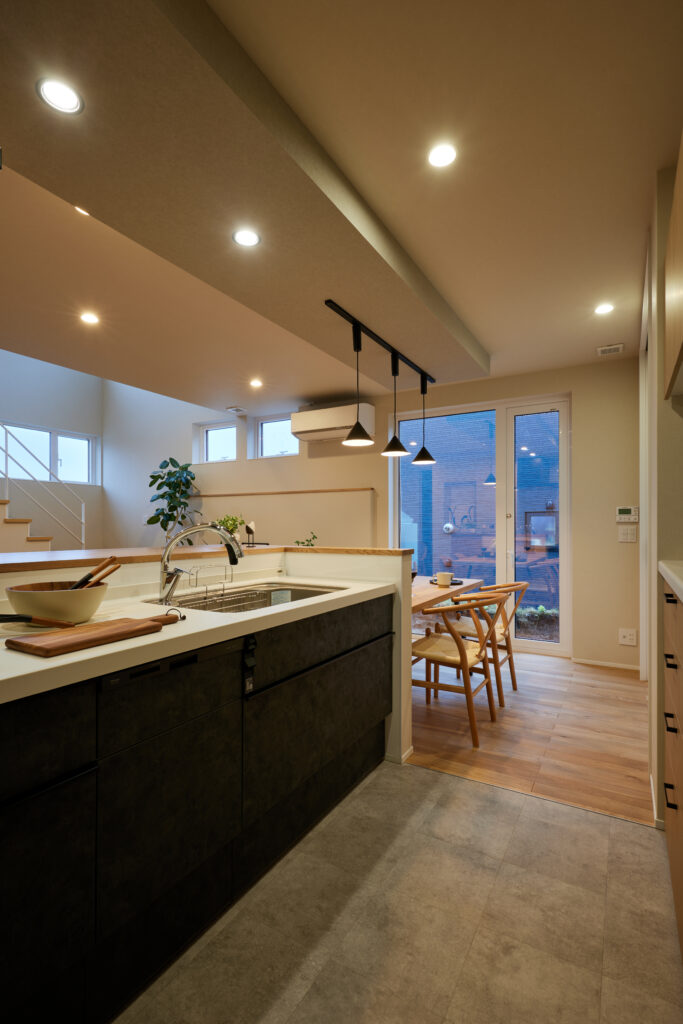 キッチンはダイニングテーブルと横並びに設置されており、料理や配膳、後片付けまでがスムーズ。回遊動線上には水回りとファミクロが連続して配置されているため、「洗う→干す→しまう」の一連の動作が短い距離で完結します。