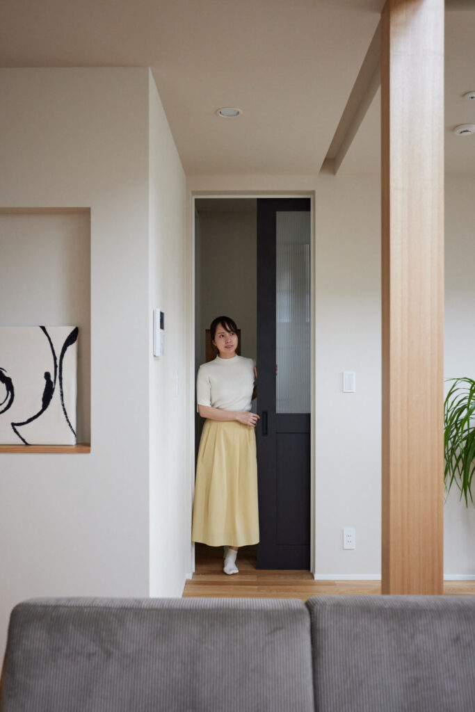 床材にはナチュラルな木をふんだんに使い、リビングからホールにかけて優しい木目が連続する設計に。空間を引き締めるアクセントとして、リビングに入る建具は黒を基調に、クロスはグレーと白で統一し、落ち着きのある雰囲気を演出しています。