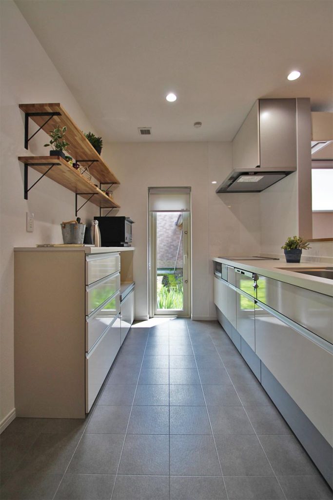 キッチンはバランスよく配置された木製の造作棚と、たっぷり入るキャビネット、食洗機付きのシステムキッチンになります。造作棚はリビングからも良く見える配置、お好きなインテリアで見せる収納もいいかもしれません。