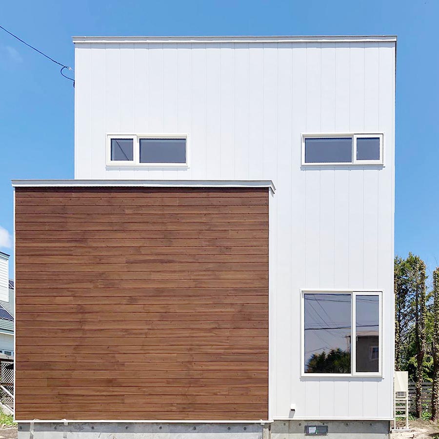 雪や雨風の防げる壁・屋根を設けた玄関ポーチの壁に木板を張り、スタイリッシュかつ長期的に維持メンテナンスのしやすい金属系サイディングとのバランスも良くカッコいい外観。